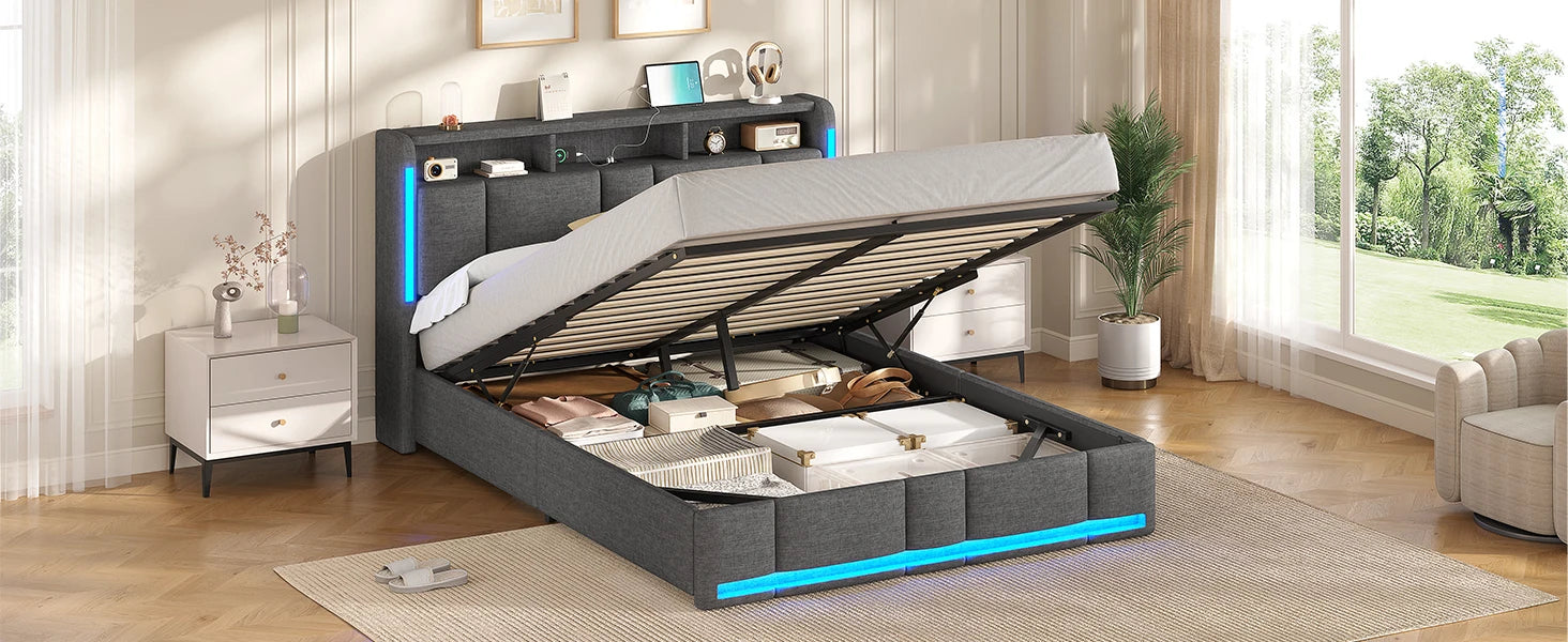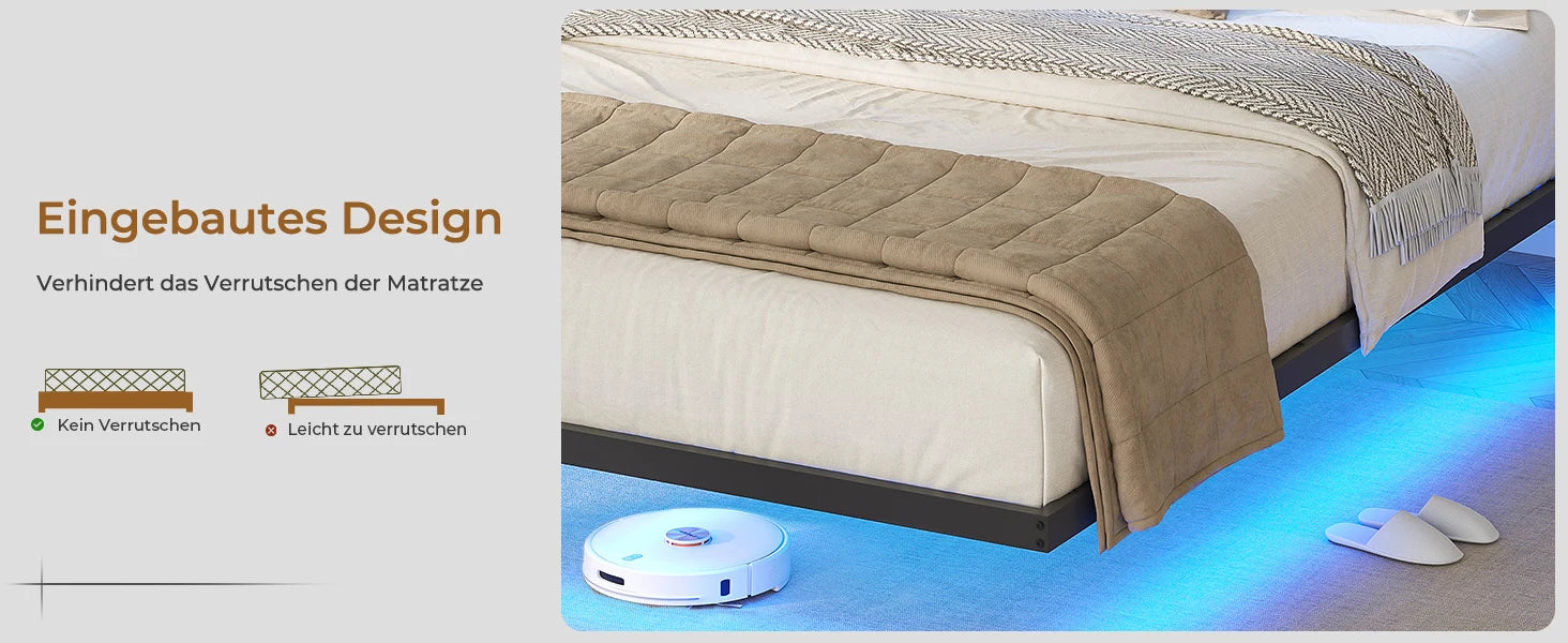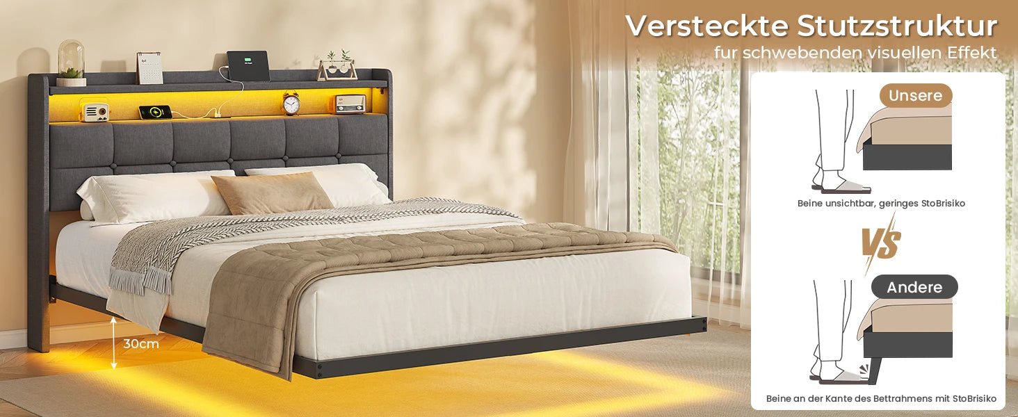 140 x 200 cm großes Polsterbett mit Doppelbettrahmen und LED-Beleuchtung und Ladestation. Kopfteil inklusive schwebendem Bettdesign