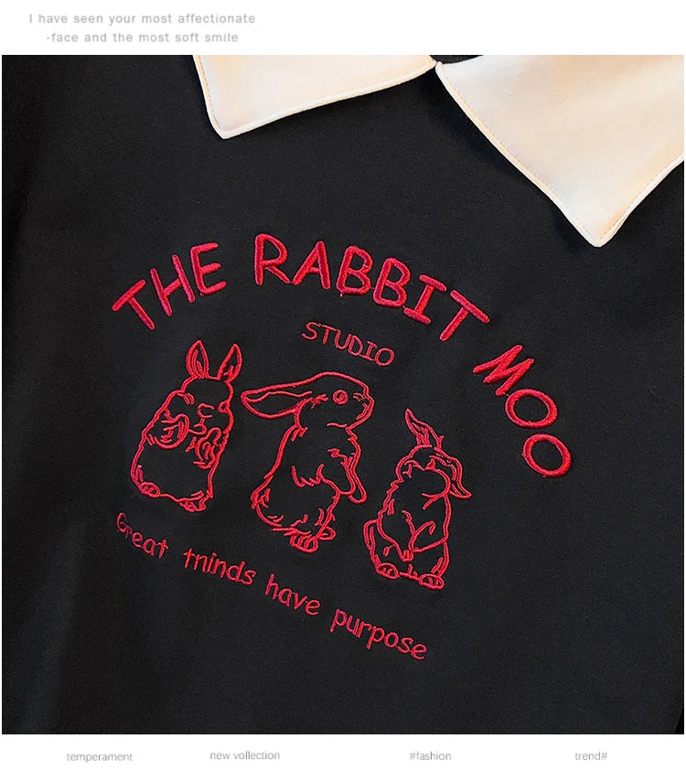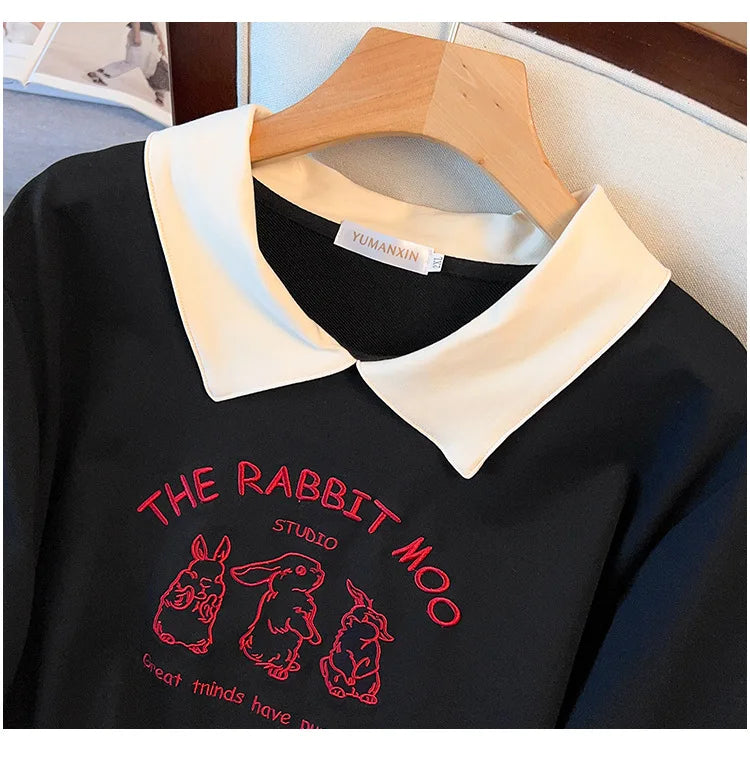 175kg plus size Damen büste Frühling Herbst loser Polo kragen Kaninchen besticktes Sweatshirt schwarz weiß 5xl 6xl 7xl 8xl 9xl