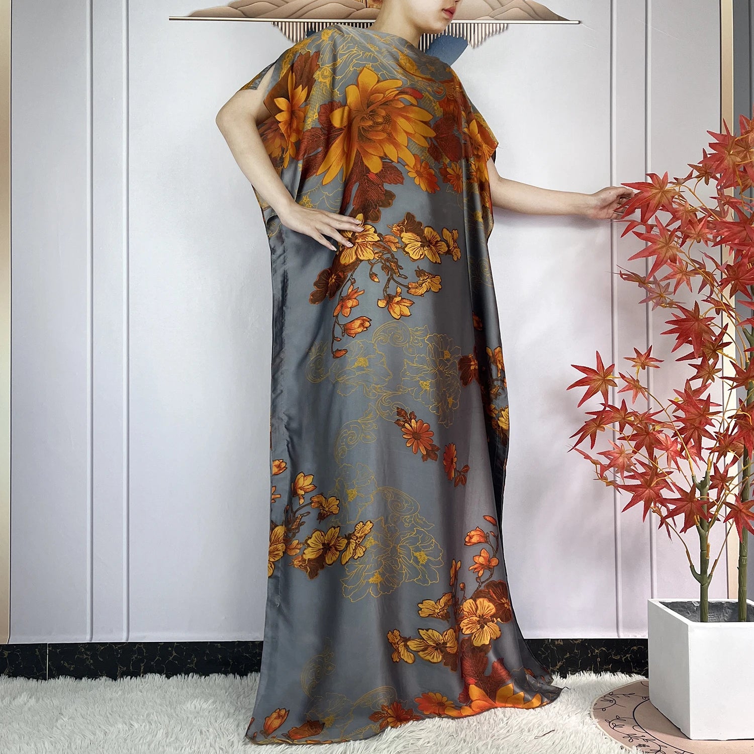 2024 New Dubai Summer Fashion For Women Printed Silk Soft Loose Femme Robe African Islam Maxi Woman Casual Dresses With Turban