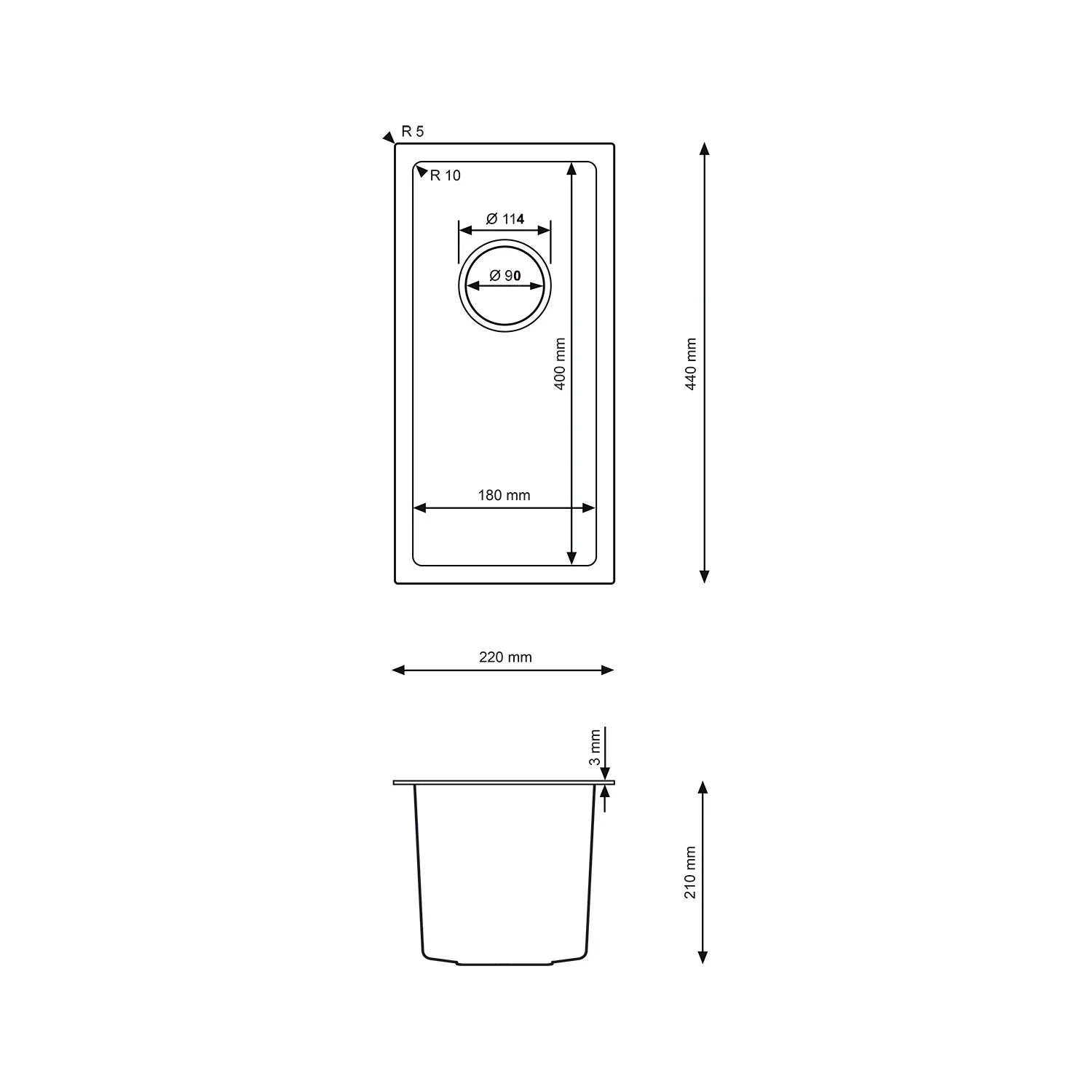 22 x 44 cm große Graphit-Edelstahl-Küchenspüle – kein Wasserhahnloch, PVD-beschichtet, oben/unter/unten/untersetzbar, mit Überlauf- und Abflussset