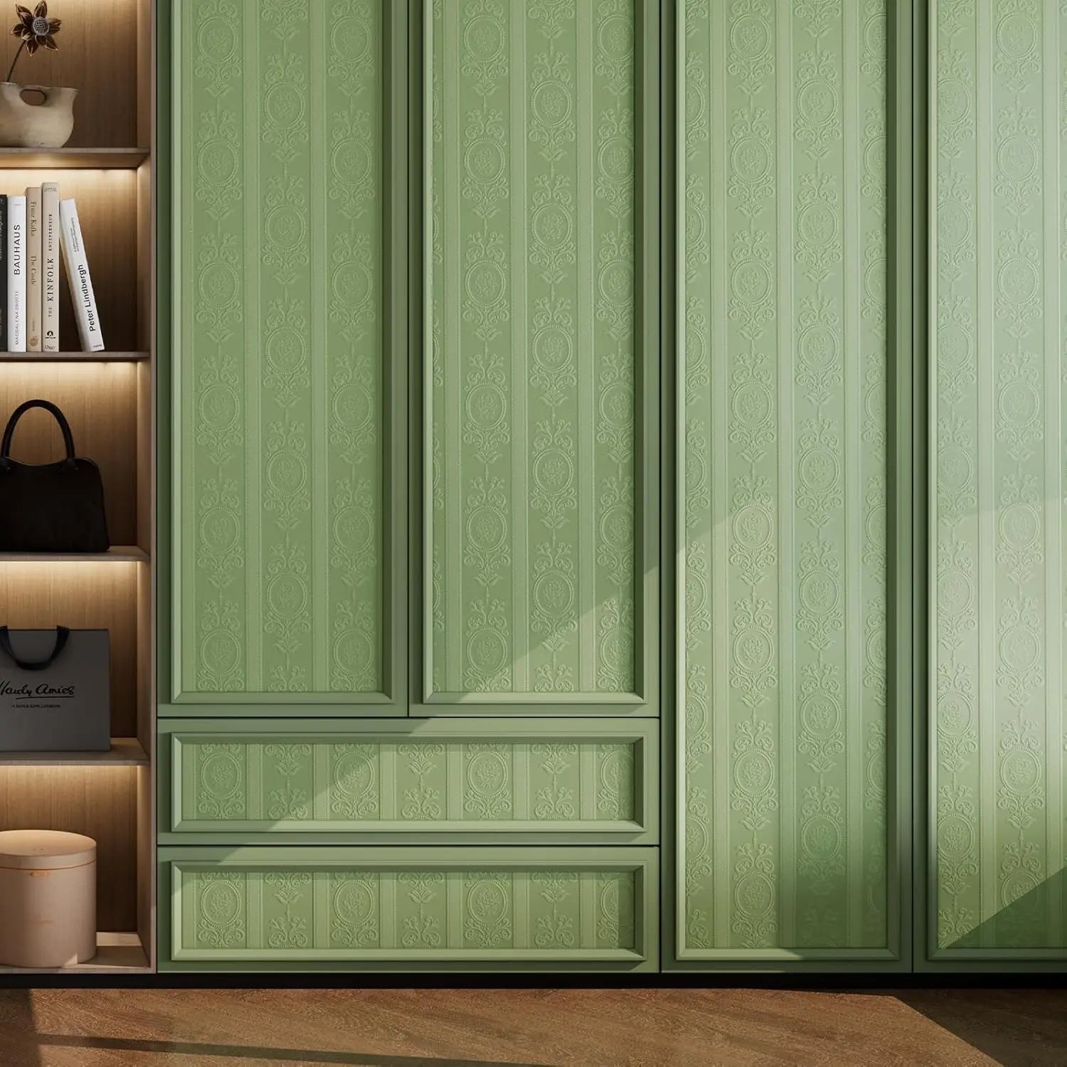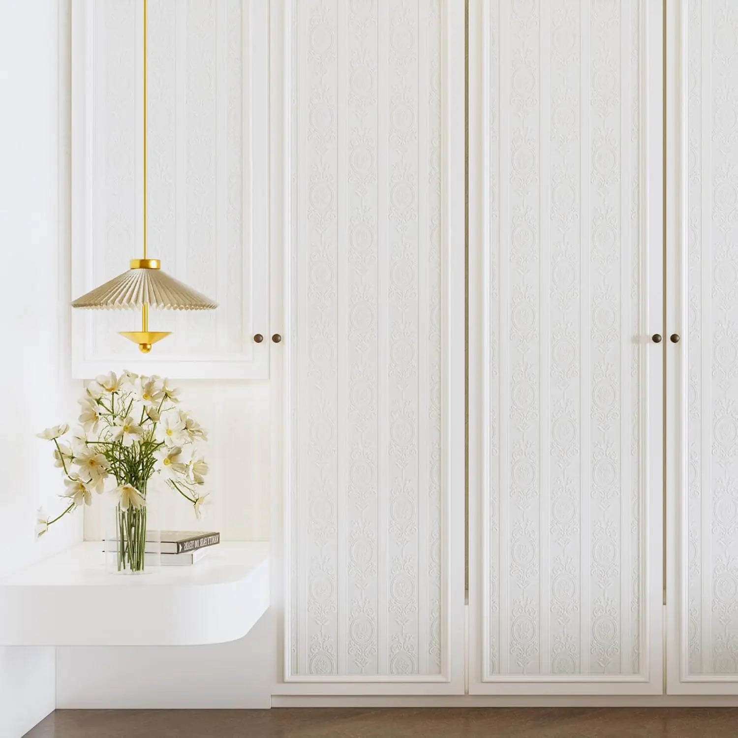 3D-Tapete mit weißer Prägung zum Abziehen und Aufkleben, Damaststruktur, selbstklebende Tapete, modernes, florales, abnehmbares Kontaktpapier