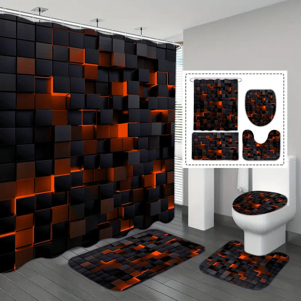 4-teiliges Set mit technologischen, blauen und schwarz karierten, bedruckten, wasserdichten Duschvorhängen mit 12 Haken, Badezimmer-Fußmatten