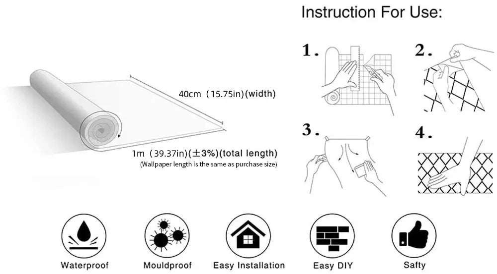 Feature: Mildew Resistant,Formaldehyde-free,Environment Friendly,Extra Thick,Self-Adhesive,Water-Resistance