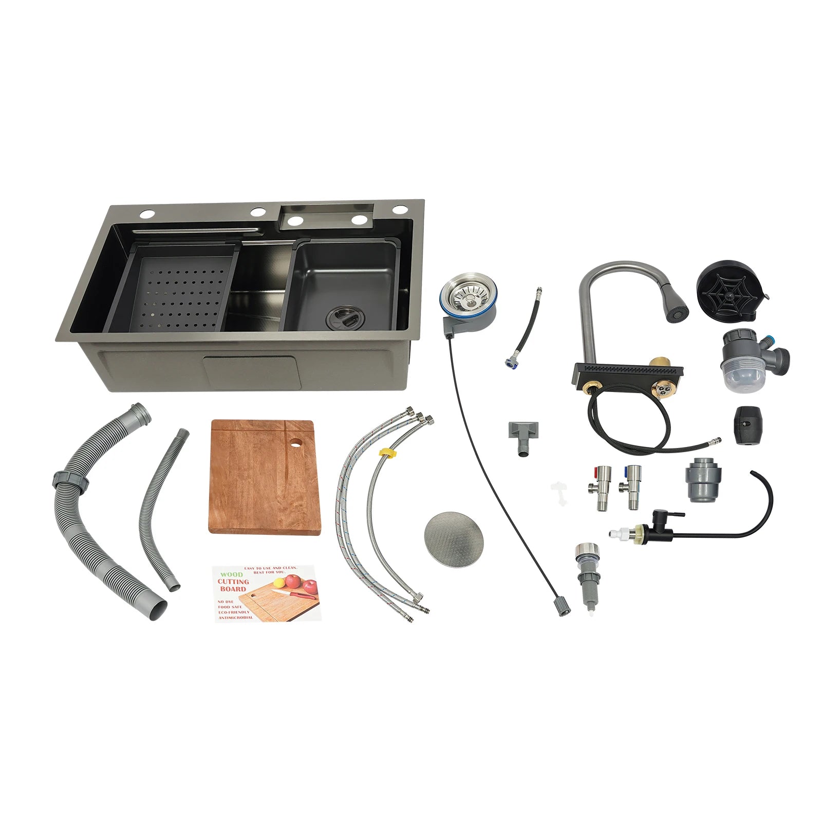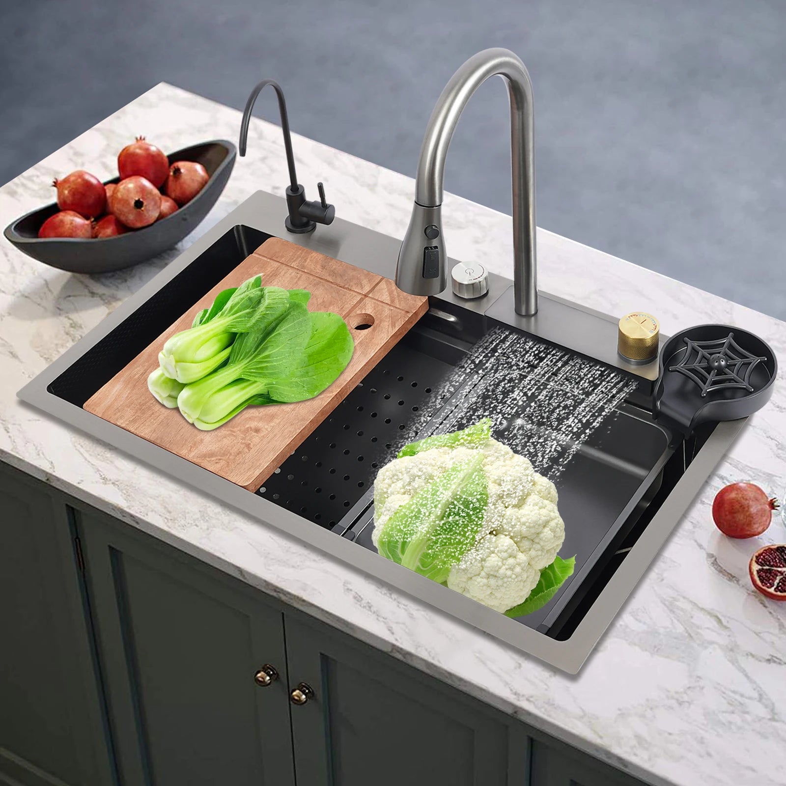75 cm große Küchenspüle aus Edelstahl, Haushaltsspülbecken-Set mit großem Fassungsvermögen und mehreren Zubehörteilen, 3 Wasserausgangsmodi