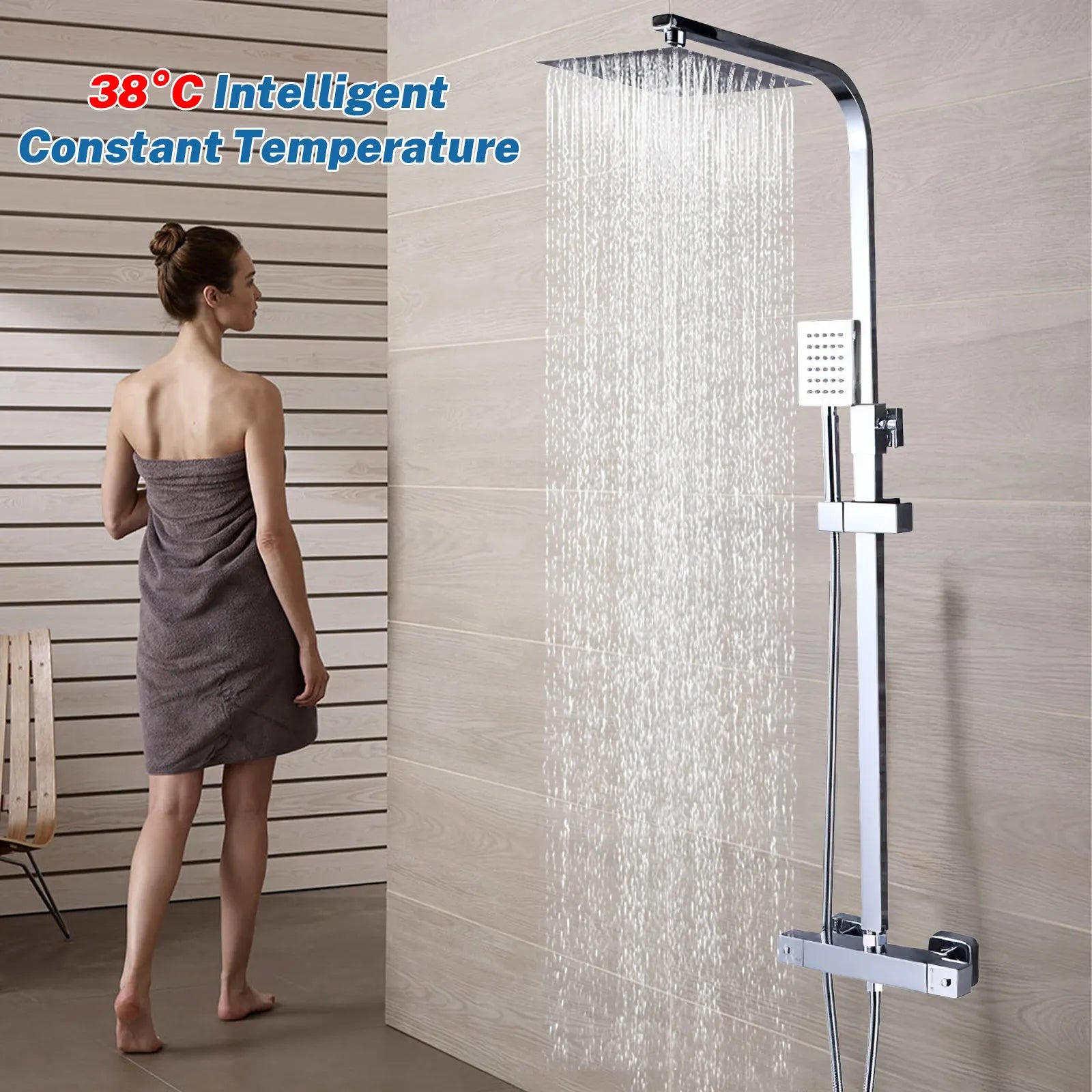 8 Inch Thermostatic Shower Set All Copper, Anti-Scald 38°C with Overhead & Handheld Sprayer, Adjustable Height for Bathroom