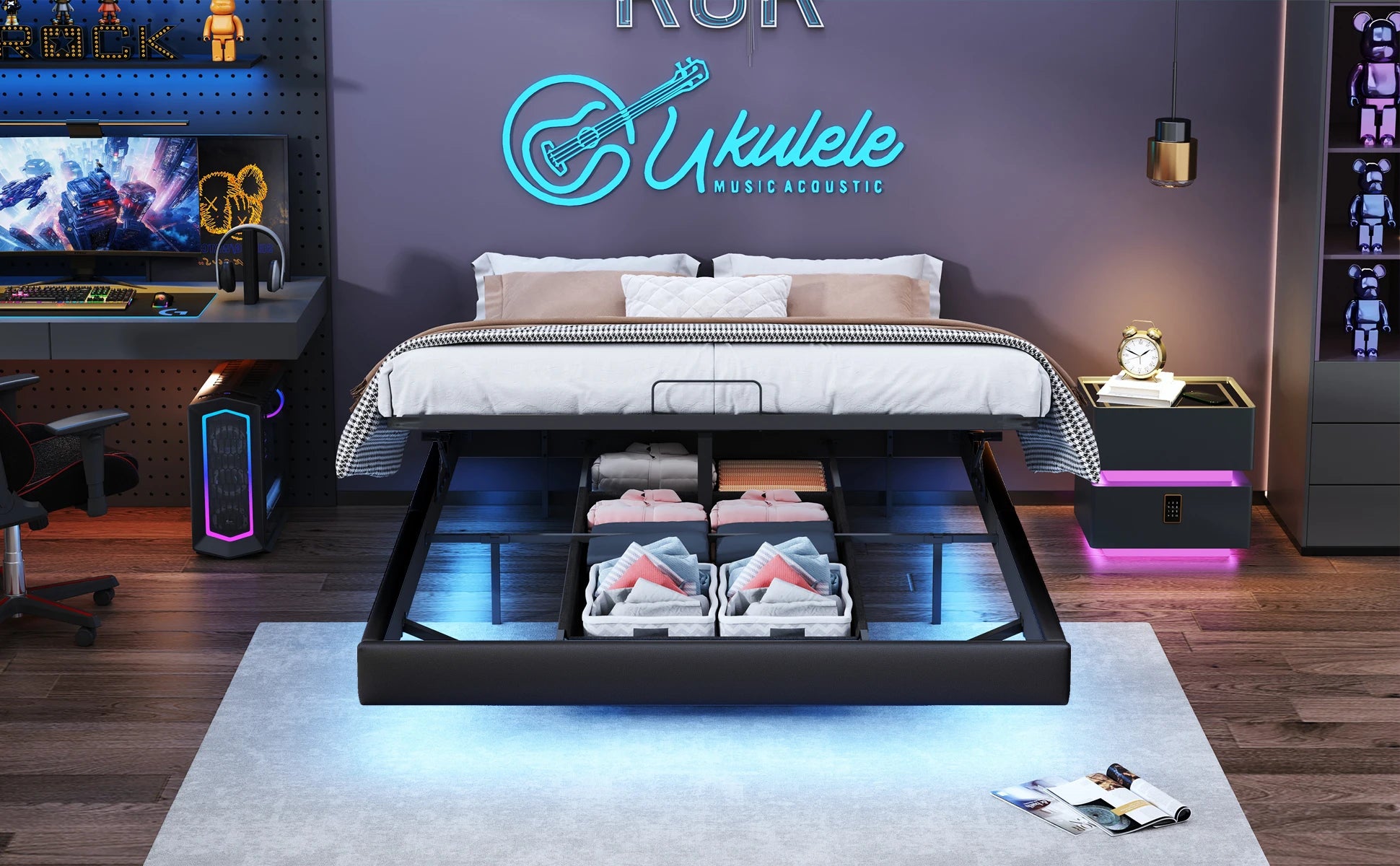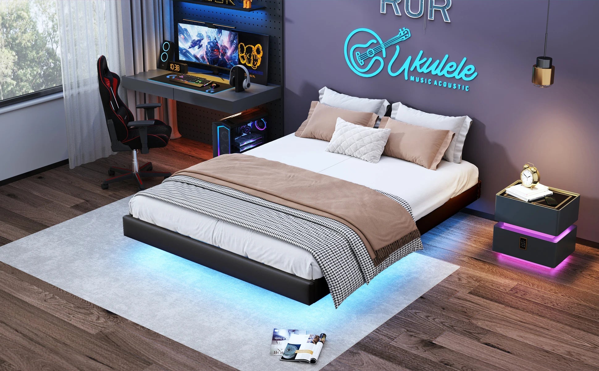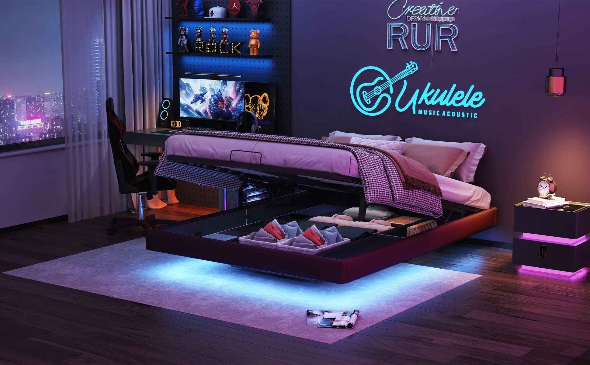 Anajqaqia Hängebettrahmen, 160 x 200 cm, schwarz, mit LED-Lichtleiste und Aufbewahrung der Gasdruckstange