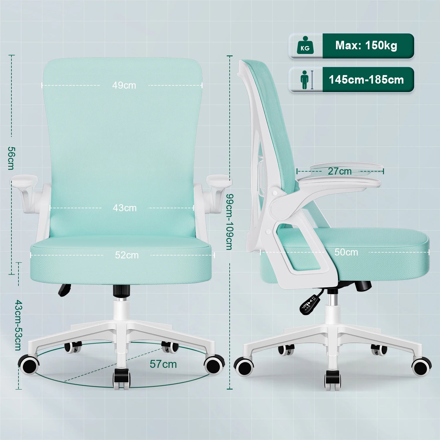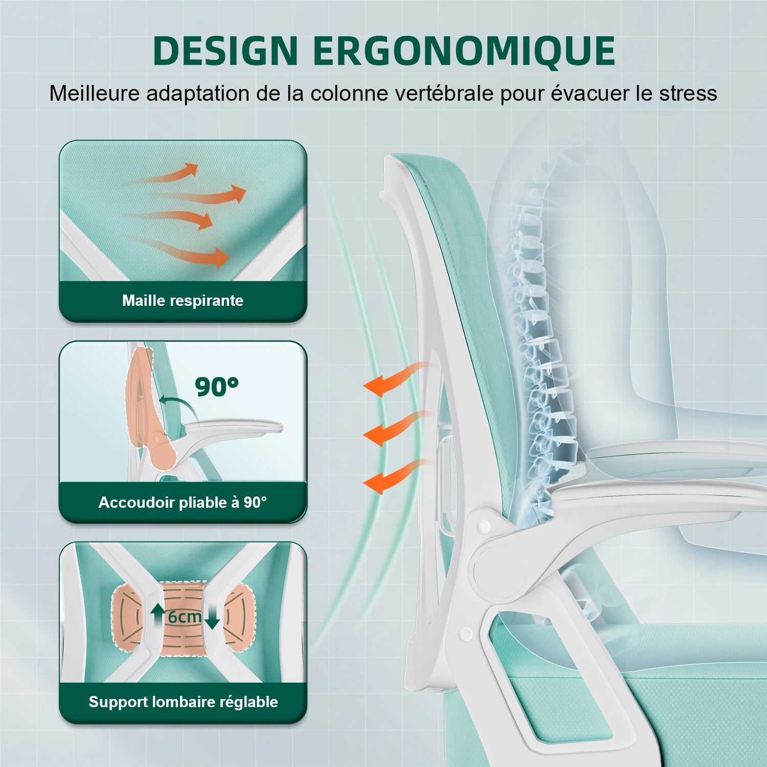 AUTHMIC Ergonomischer Netz-Bürostuhl mit Lordosenstütze, hochklappbaren Armlehnen, verstellbarer und höhenverstellbar für den Schreibtisch zu Hause – Blaugrün