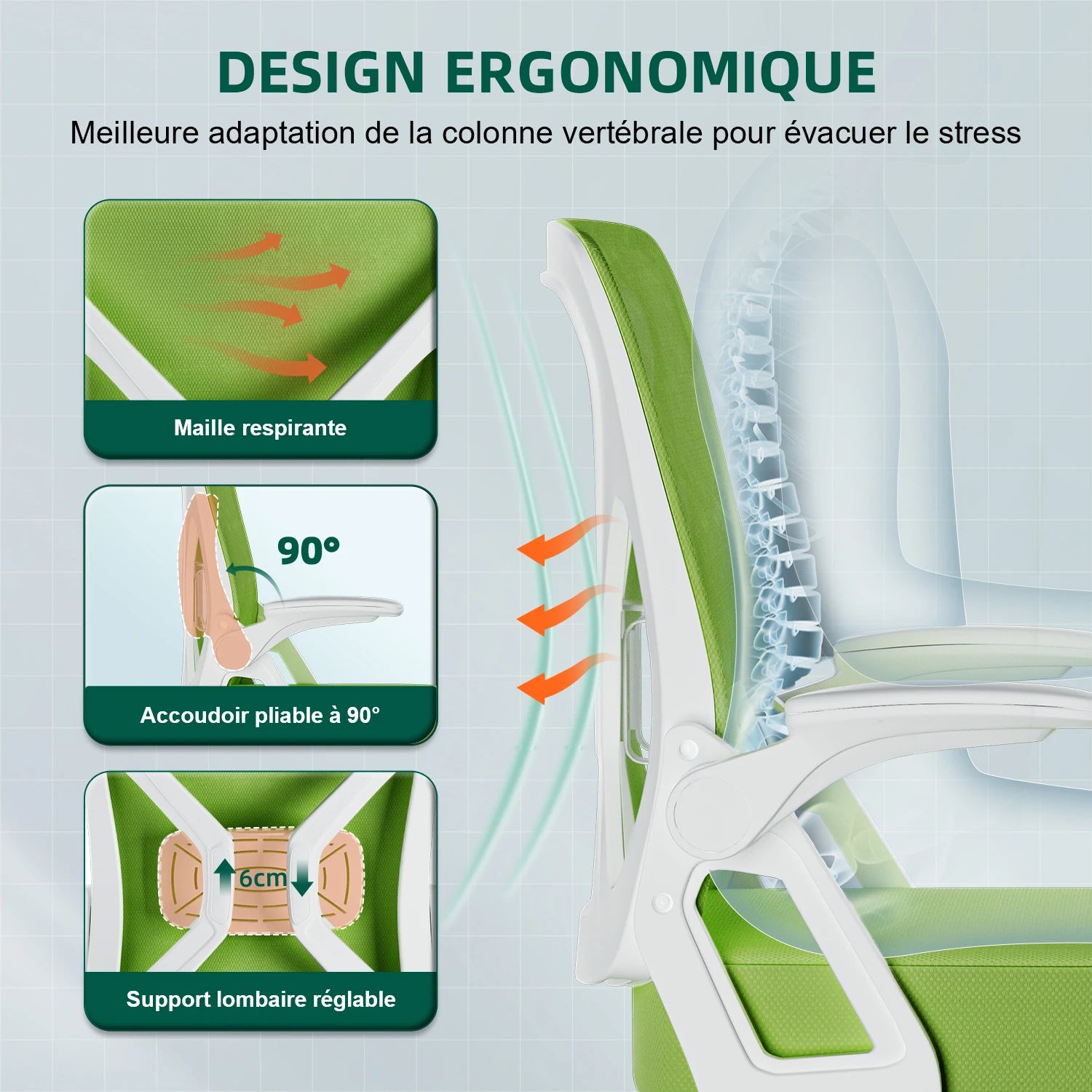 AUTHMIC Ergonomischer Netz-Bürostuhl mit Lordosenstütze, hochklappbaren Armlehnen, verstellbarer und höhenverstellbar für den Schreibtisch zu Hause – Grün