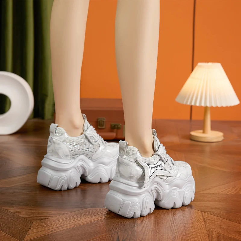 AUTUSPIN 10cm Pink Thick Soled Shoes for Summer Women Breathable Lace-up Ladies Sneakers Outdoor Casual Fashion Platform Shoes