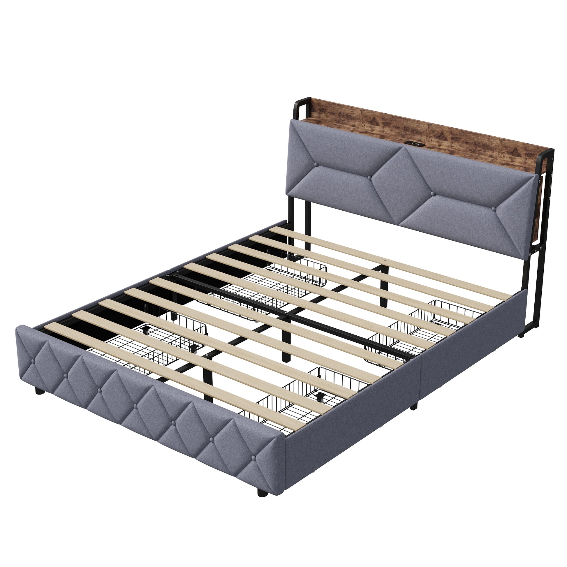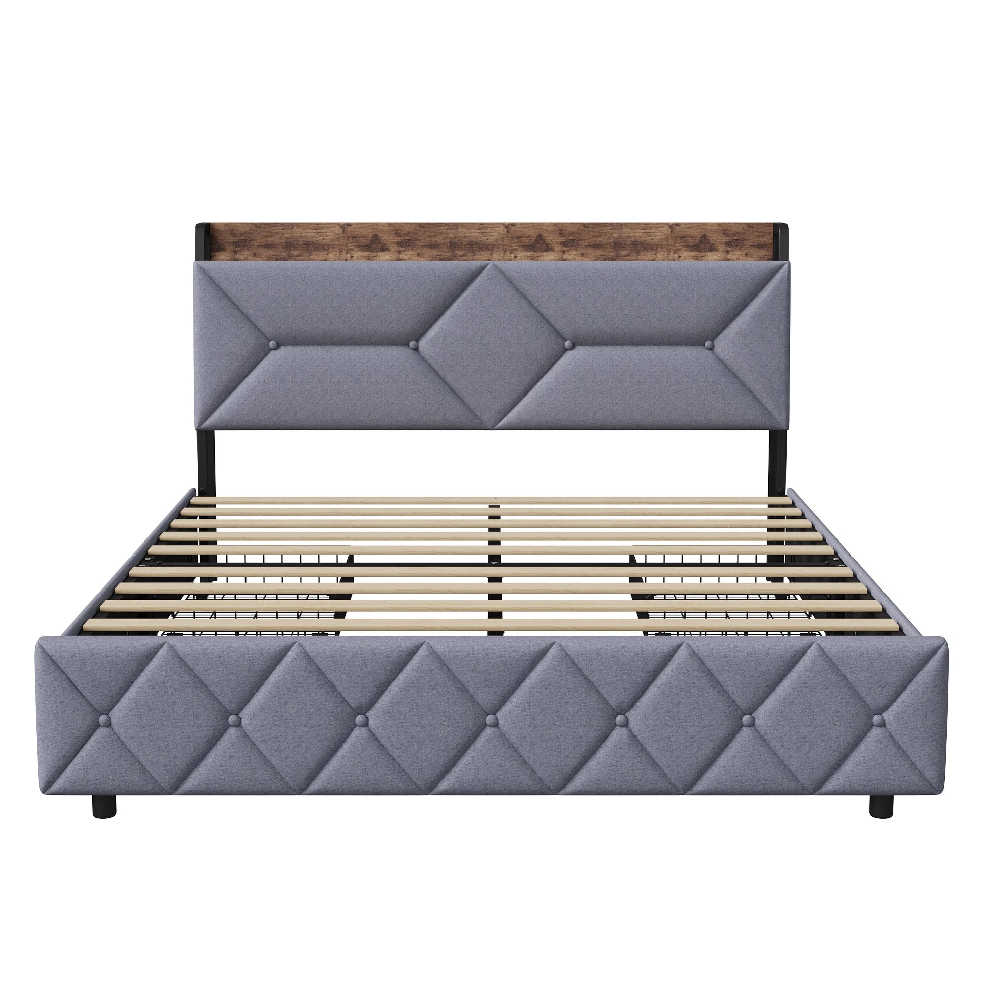 Bett 160 x 200 mit USB, Doppelbett mit 4 Schubladen, Kopfteil mit ausziehbarem Stauraum, Erwachsenenbett mit Lattenrost aus Holz