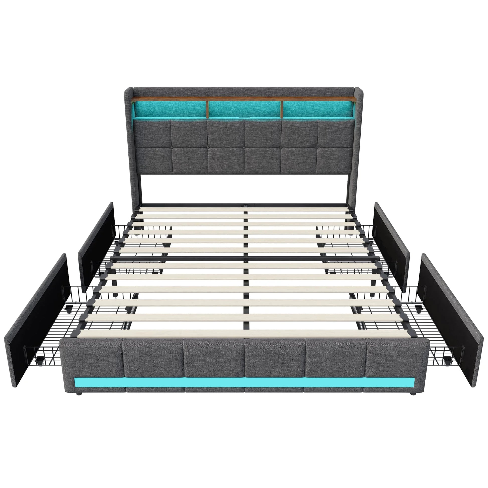 Bett mit Schubladen, 140/160 x 200 cm, Stauraumbett mit USB-Ladefunktion und LED-Kopfteil, Doppelbett mit Stauraum und 4 Schubladen. Jugendbett, funktionales Bett, Kopfteil, Lattenrost aus Holz, grau.