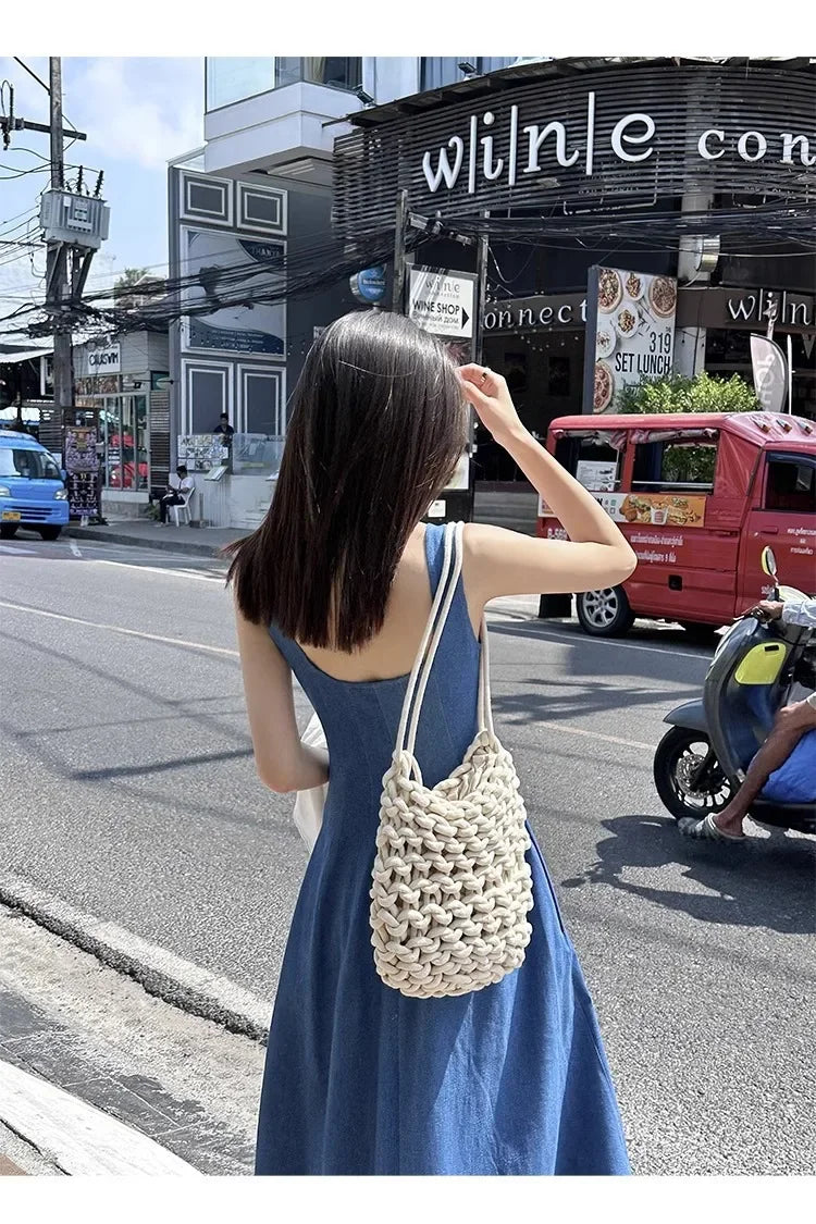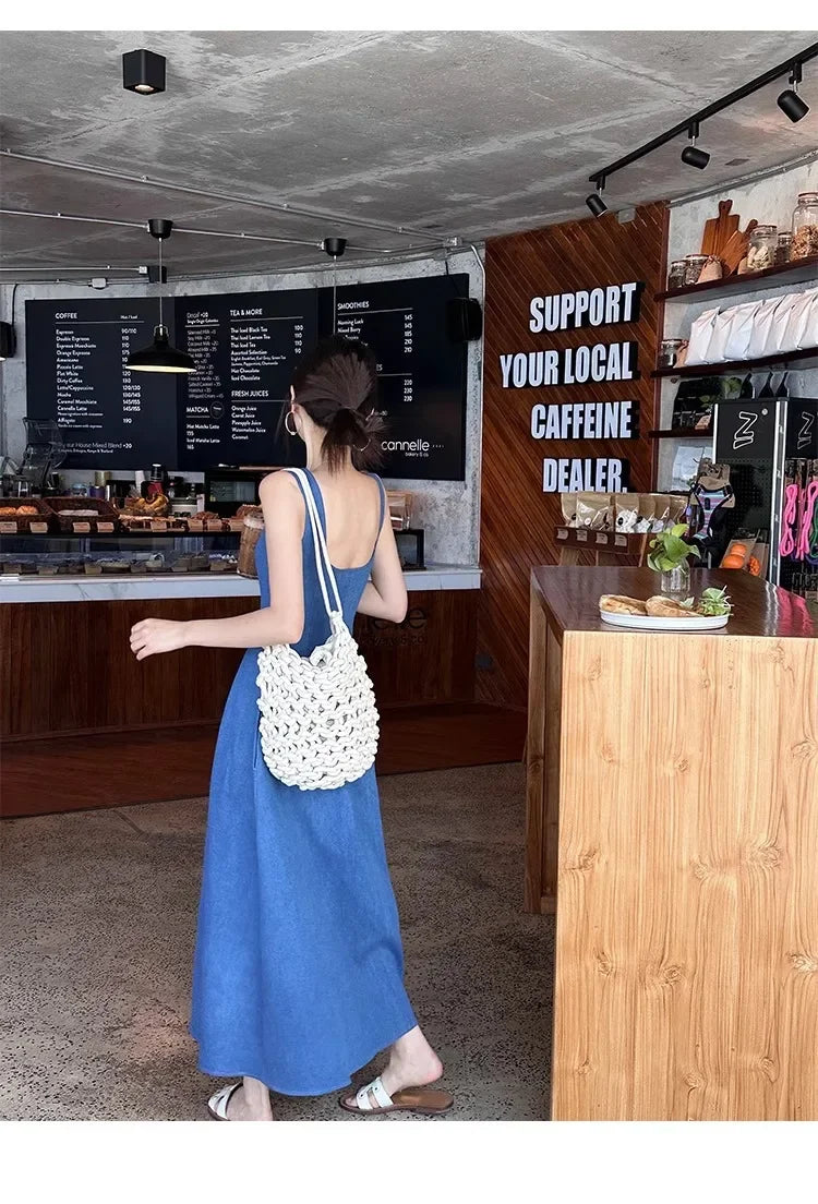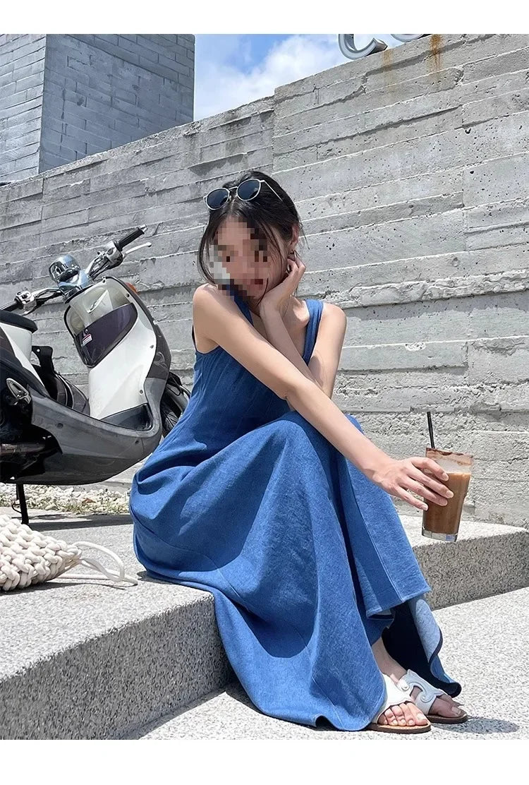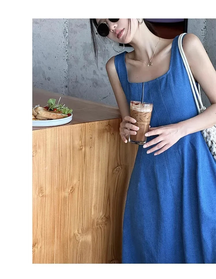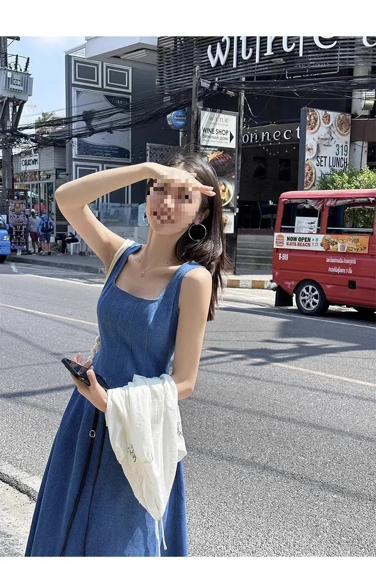 Blue Mist Love Französisches Jeanskleid für Damen, Sommer, einzigartiges Design, Taille, Cinching-Riemen, langes Kleid, elegante blaue Polyesterfaser