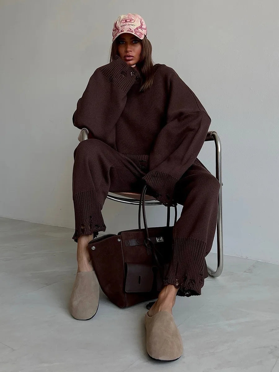 Bornladies Autumn Winter Women's New Turtleneck Knit Sweater Skinny Knit Pants Set Soft Oversized Ripped Hem Fashion Pullover