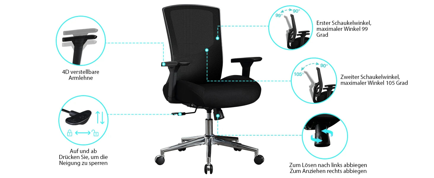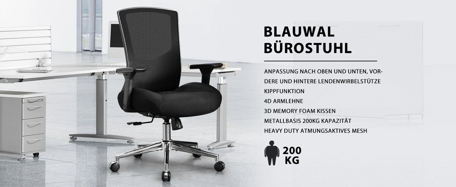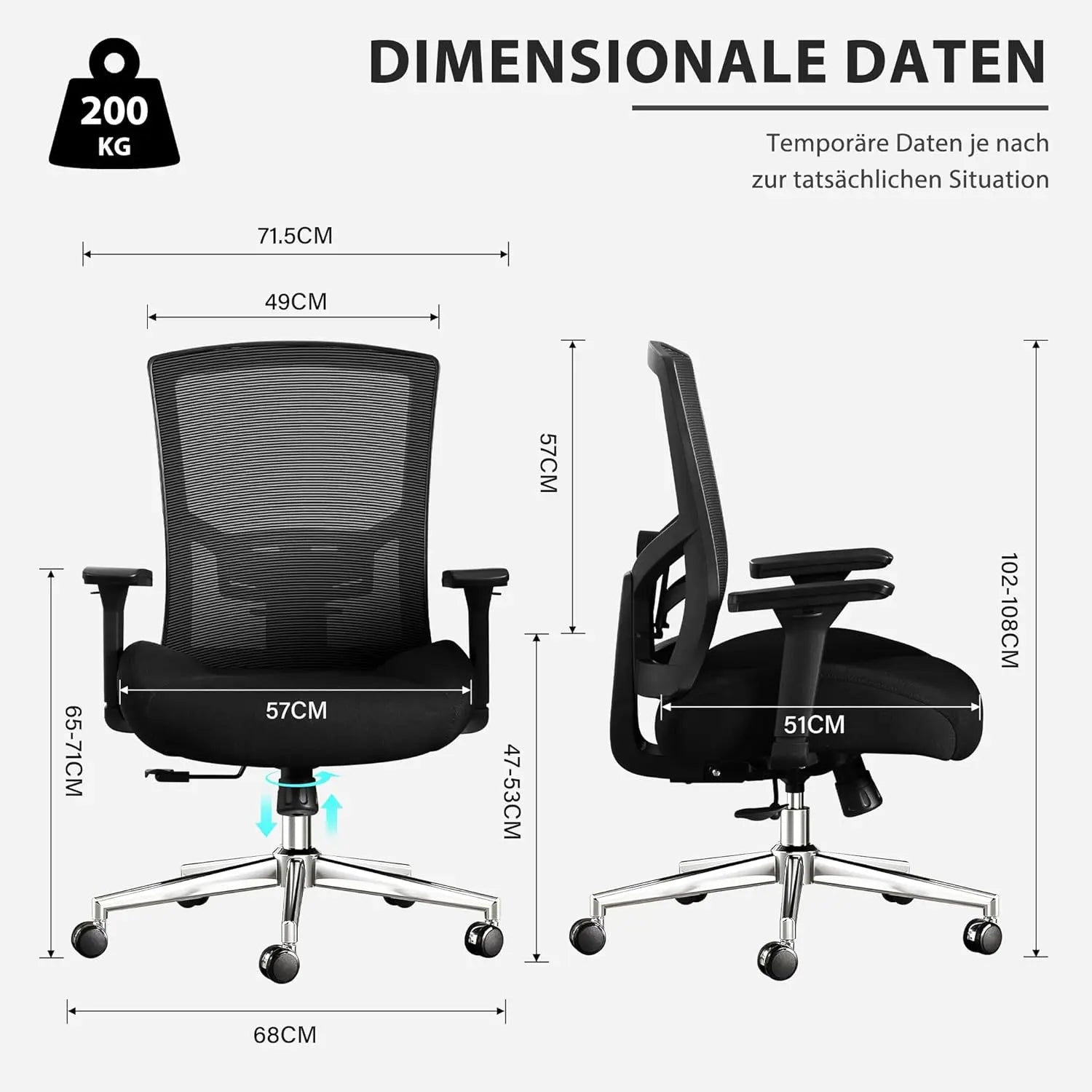 Bürostuhl 200 kg Ergonomischer Schreibtischstuhl mit 4D-Armlehnen, Bürostuhl mit Lendenwirbelstütze und 3D-verstellbarem, Wippfunkti