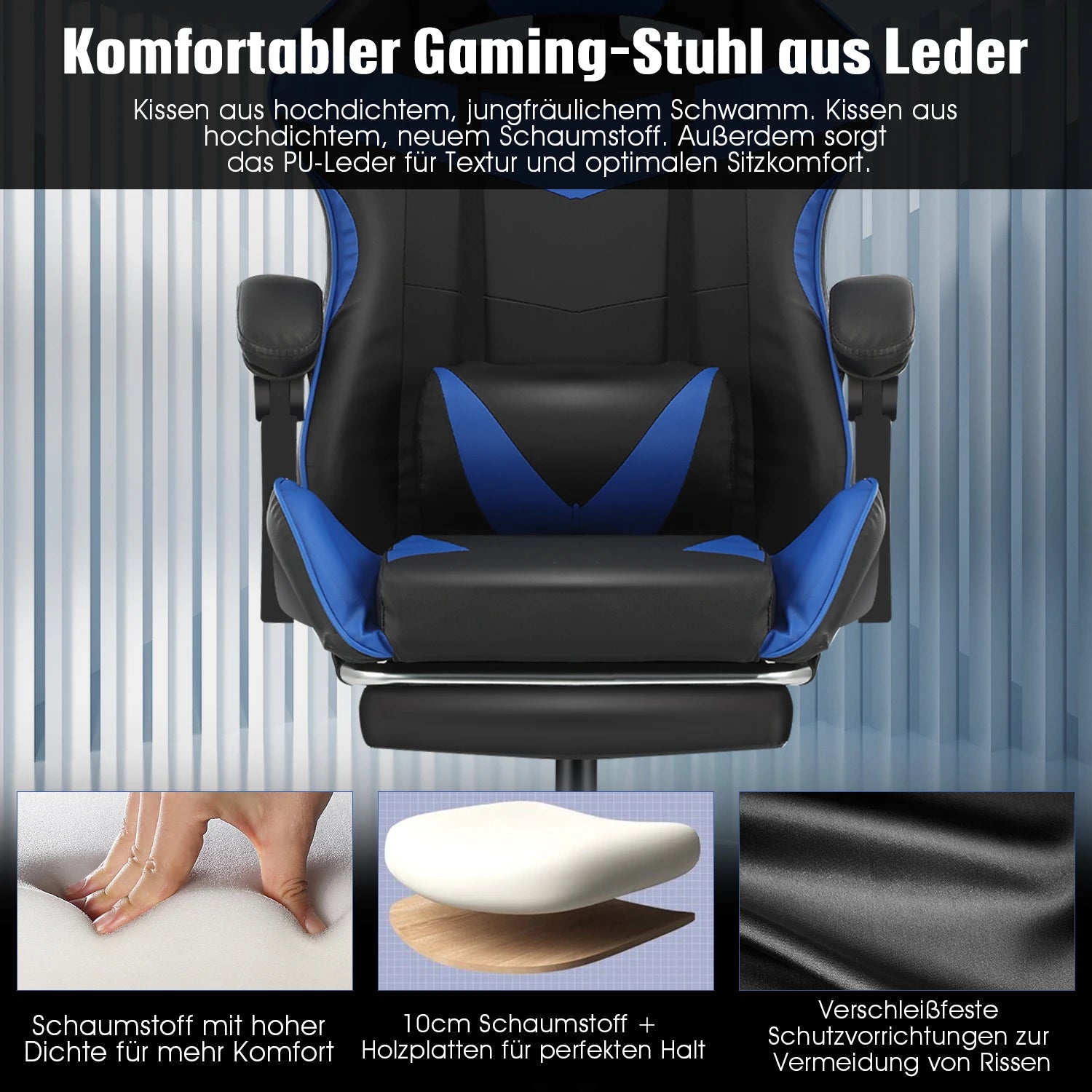Bürostuhl Ergonomisch Gaming Stuhl Massage Gaming Sessel mit Kopfstütze Massage-Lendenkissen, Gepolstert Gaming Chair, Drehsessel,150kg Kapazität,Schwarz Blau