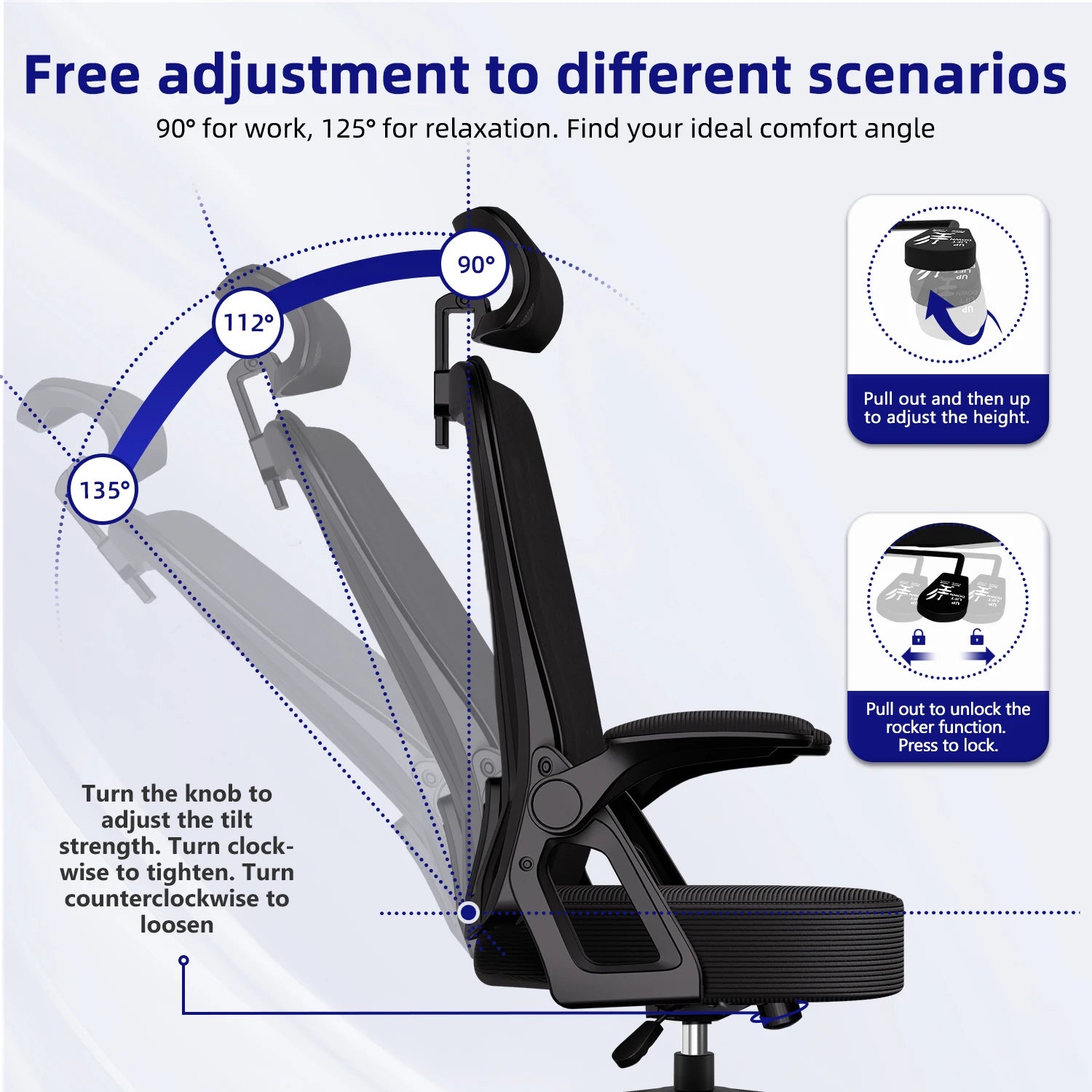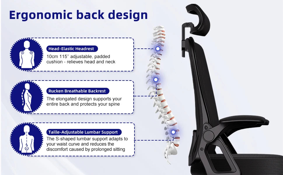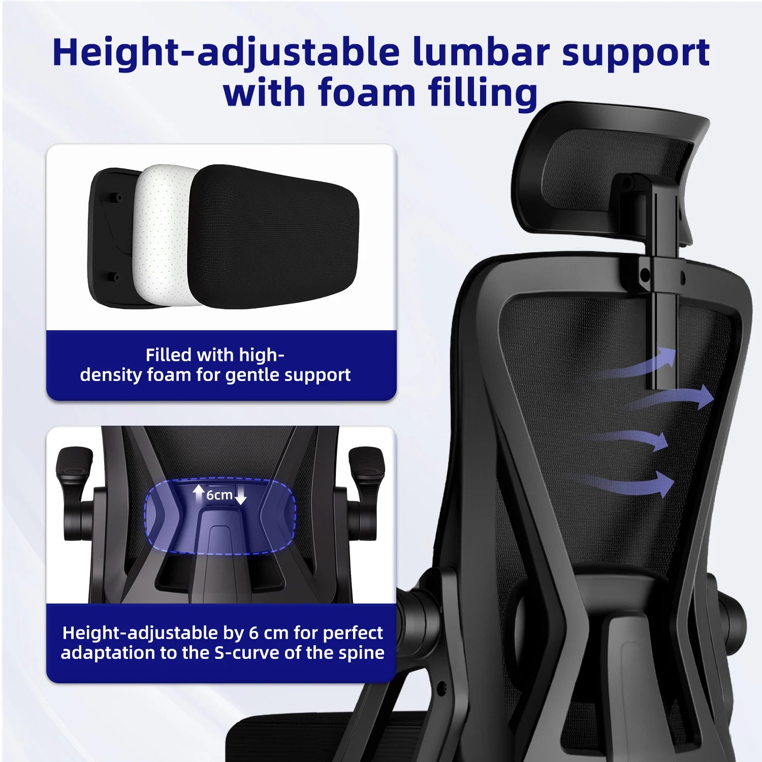 Bürostuhl, ergonomisch, verstellbar, 90er ° -135 ° ,Schreibtischstuhl mit Lordosenstütze, Computerstuhl mit verstellbarer Kopfstütze, Wohnzimmerstühle