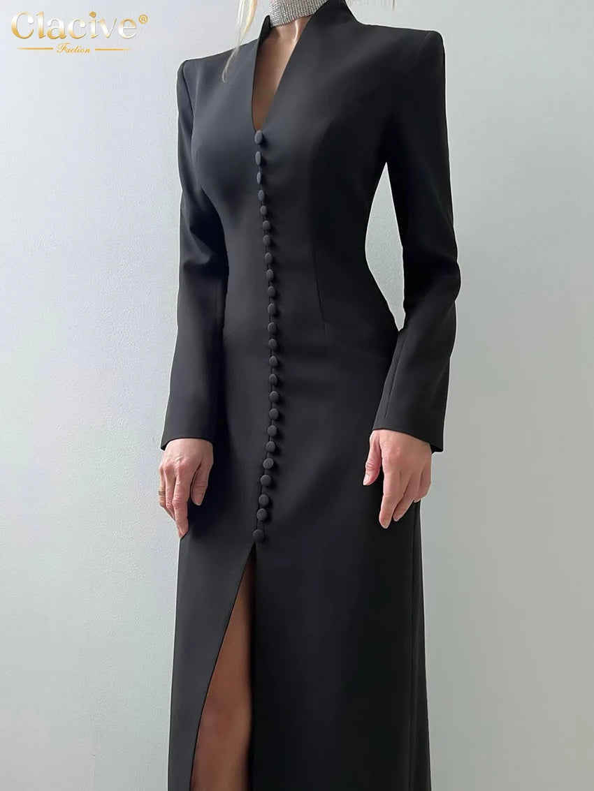 Clacive Sexy schlankes weißes Damenkleid 2025, modisches V-Ausschnitt, lange Ärmel, knöchellanges Kleid, elegantes, klassisches, geschlitztes Damenkleid