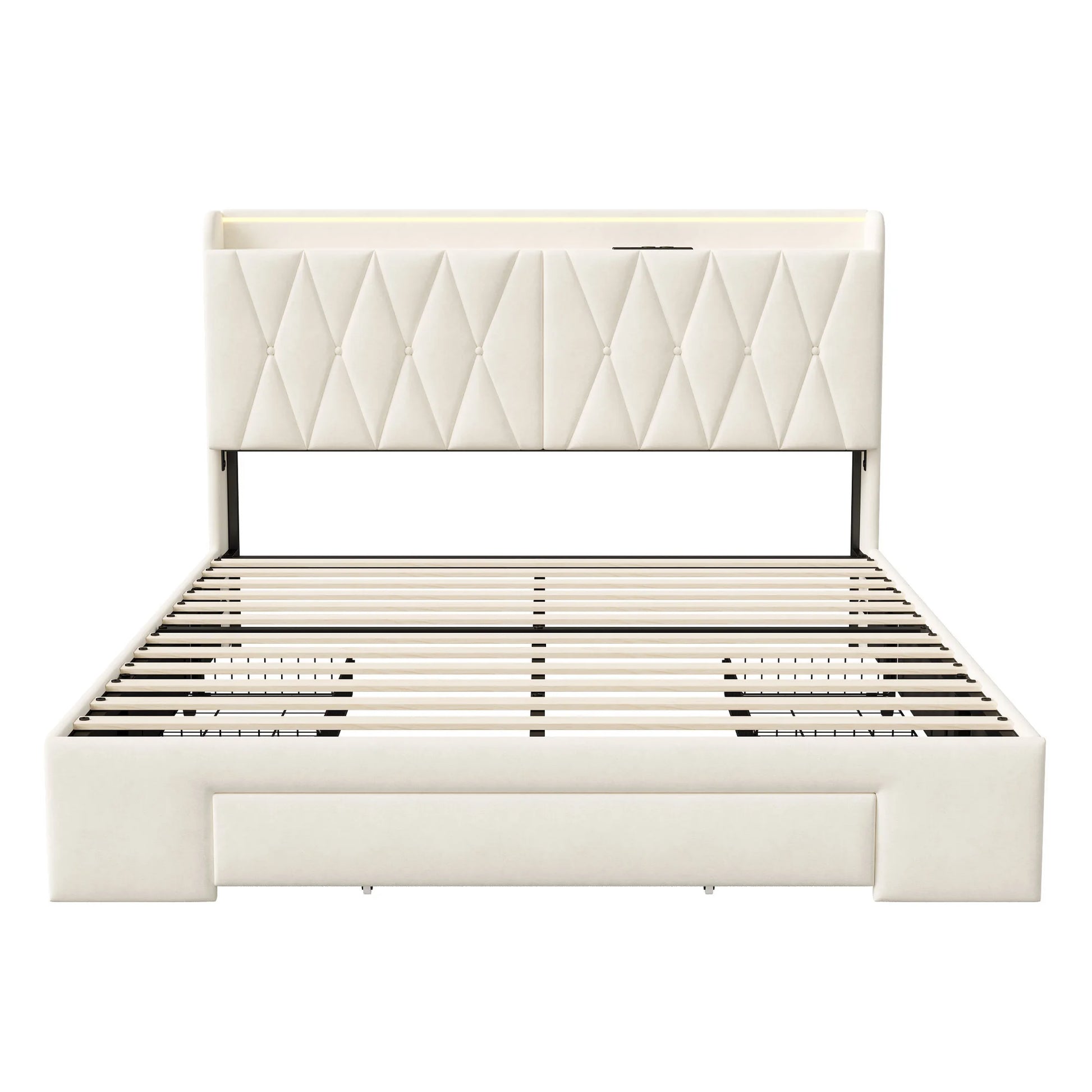 Comanlai Polsterbett 140 x 200 cm, Doppelbett mit 3 Schubladen, USB-Ladefunktion, ohne Matratze, Samt, Beige