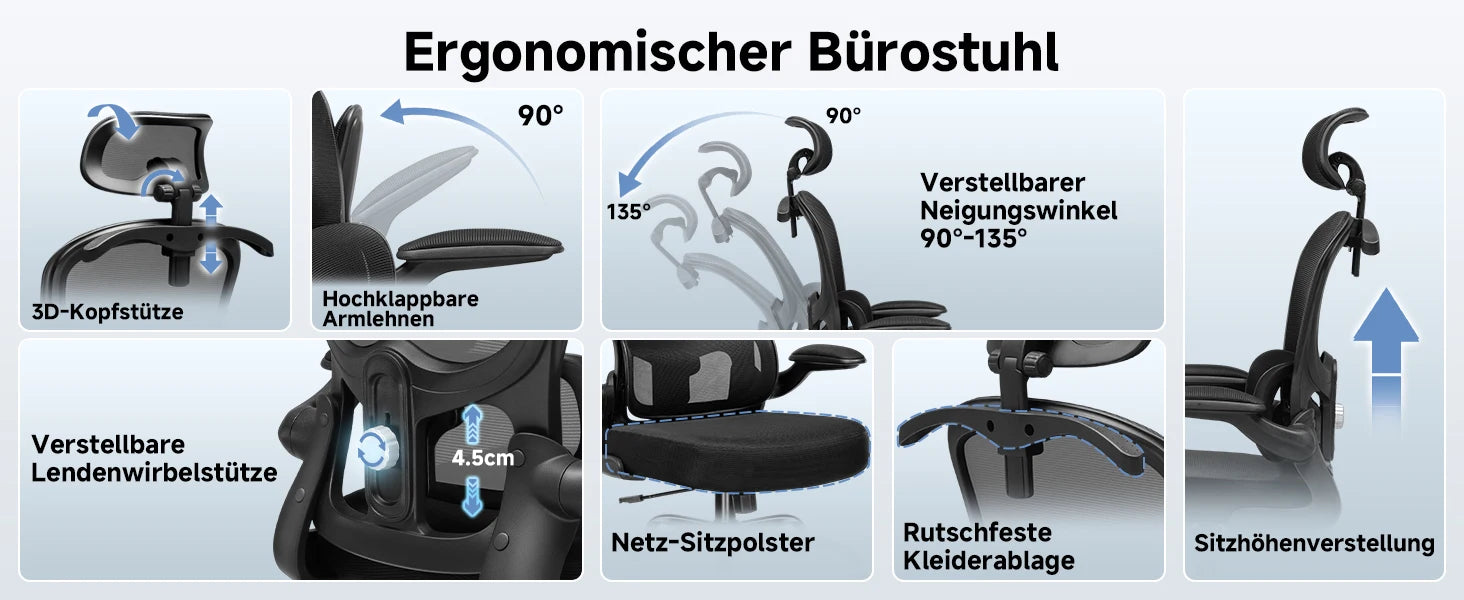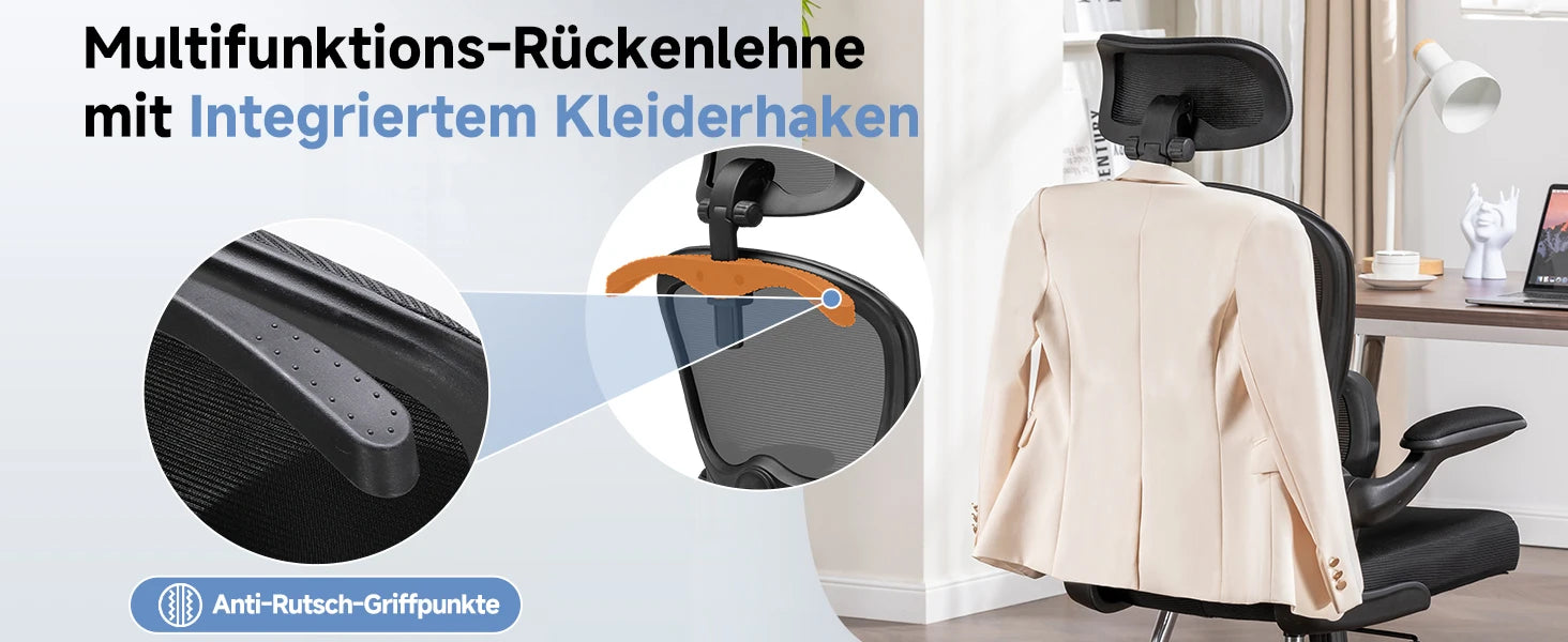 COMHOMA Bürostuhl Ergonomisch, Schreibtischstuhl mit 3D Kopfstütze und Lendenwirbelstütze, Integriertes Kleiderhaken-Design