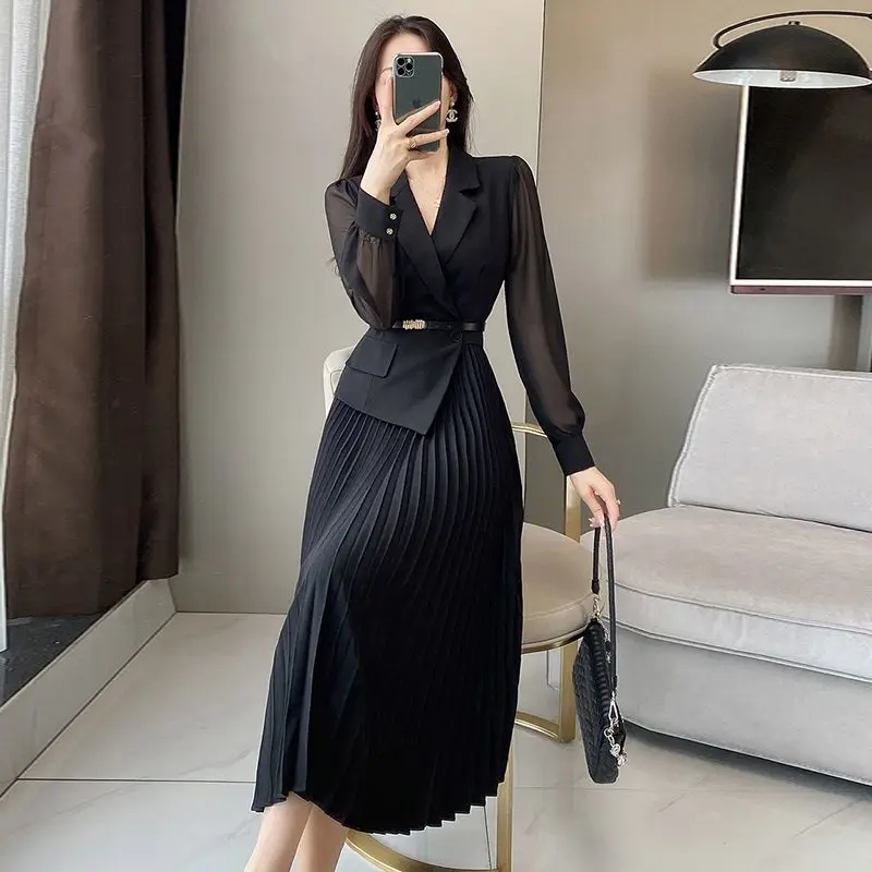 Damen koreanische Mode Blazer Patchwork Design Langarm Kleider Büro Dame elegante hohe Taille schwarz schlank plissiert Midi-Kleid