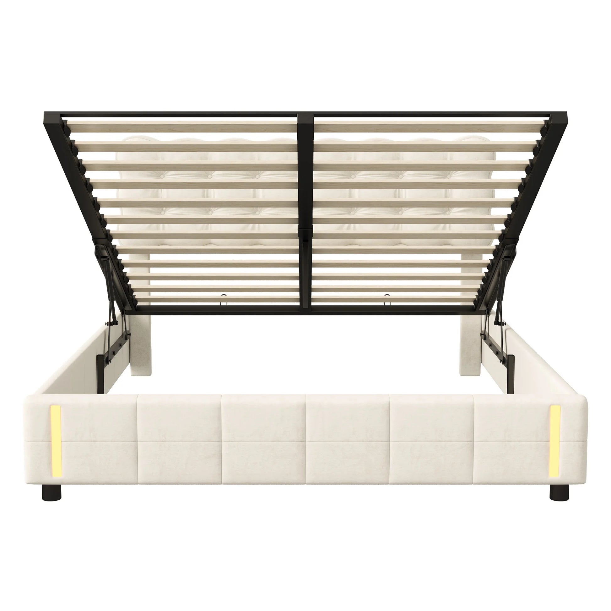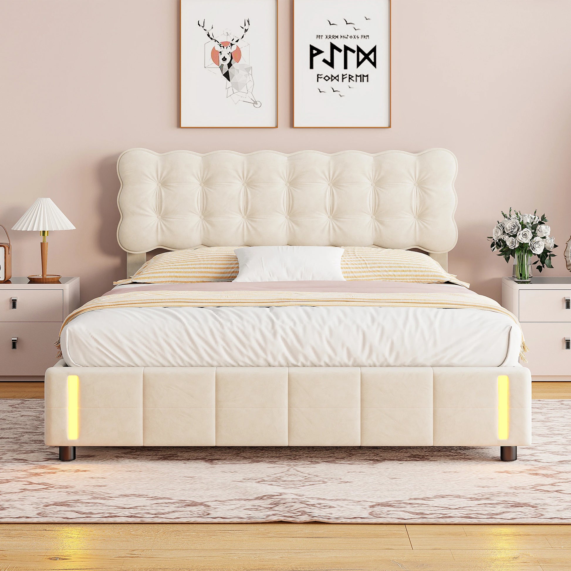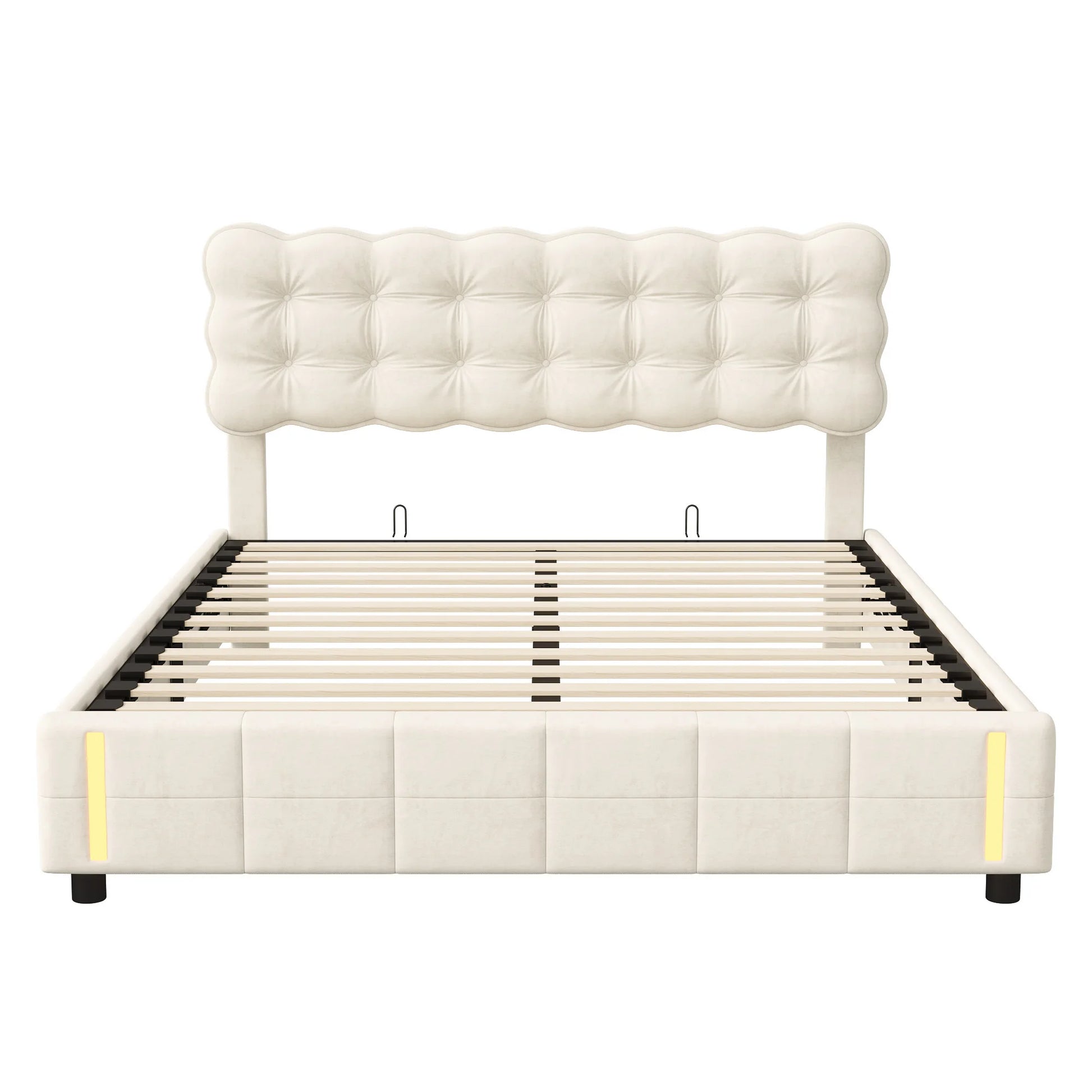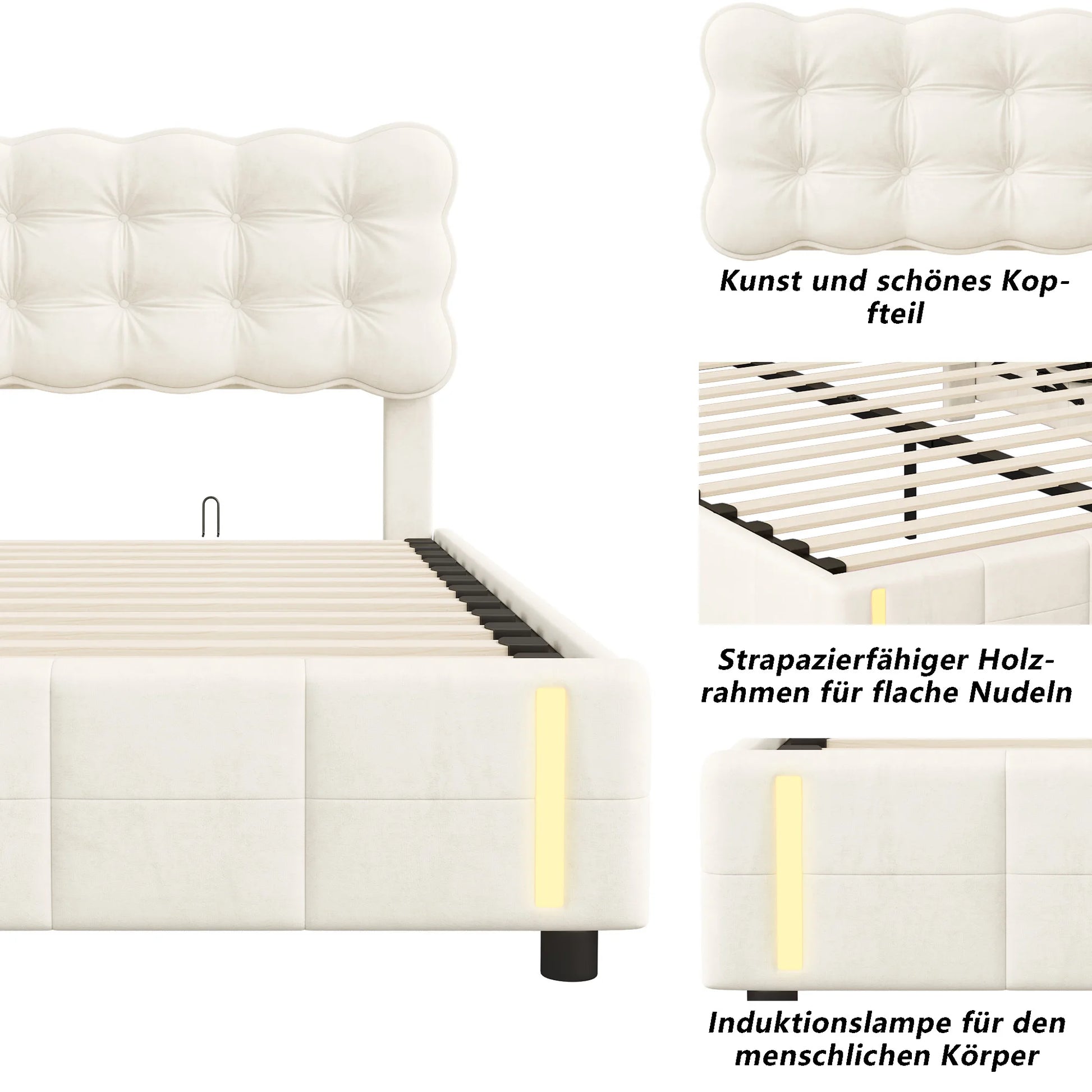 Doppelbett 140x200 cm mit LED-Beleuchtung und Stauraum, Luftdruckbett, Lattenrost, Samt, beige, ohne Matratze