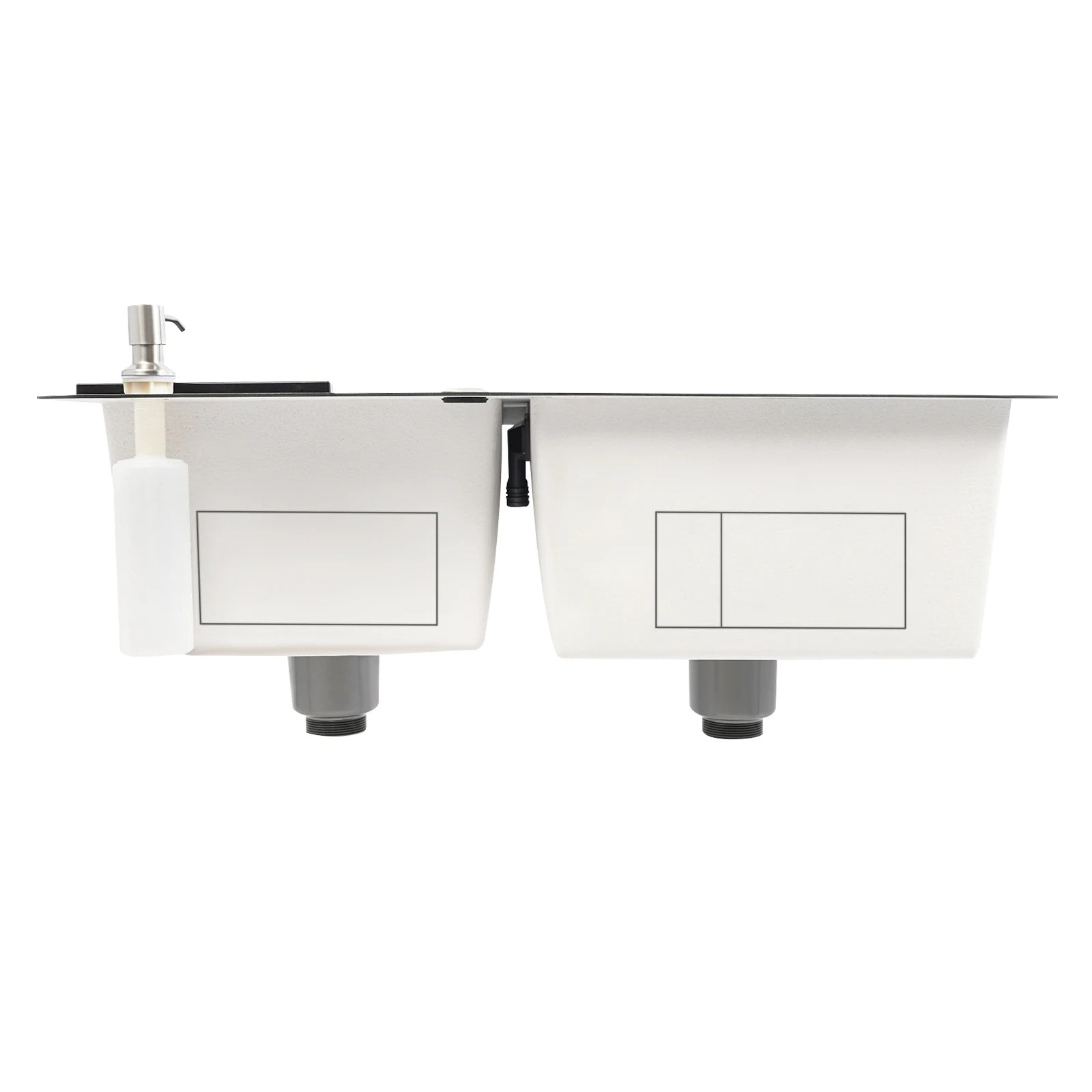Doppelschüssel-Küchenspüle mit Seifenspender, Abflusskorb, Rohre, Edelstahl 304, 78 x 43 x 22 cm, zusätzliche Aufbewahrung für Restaurants