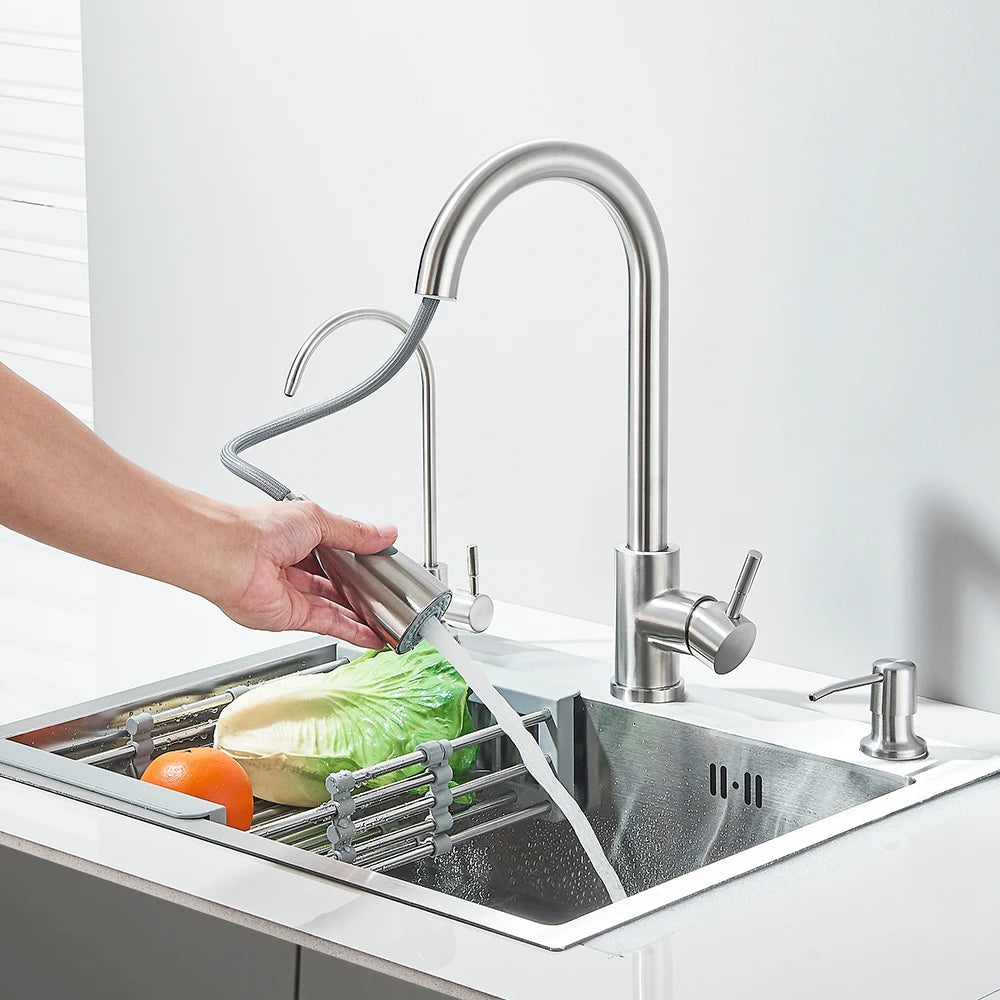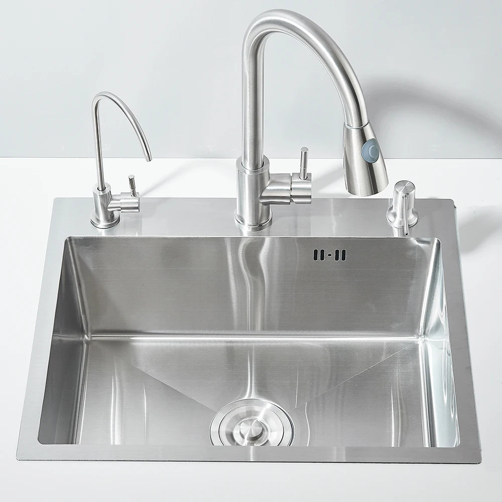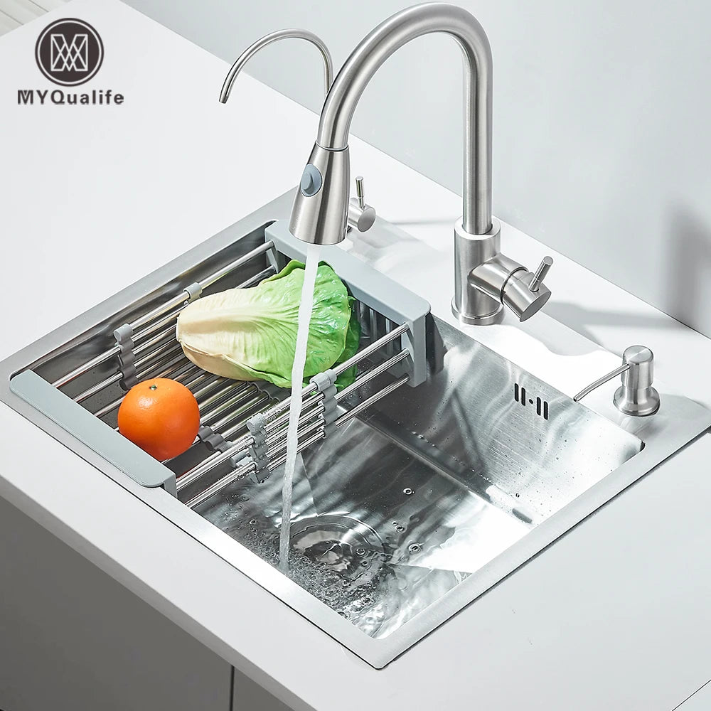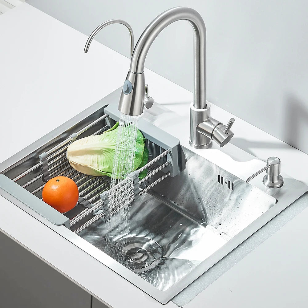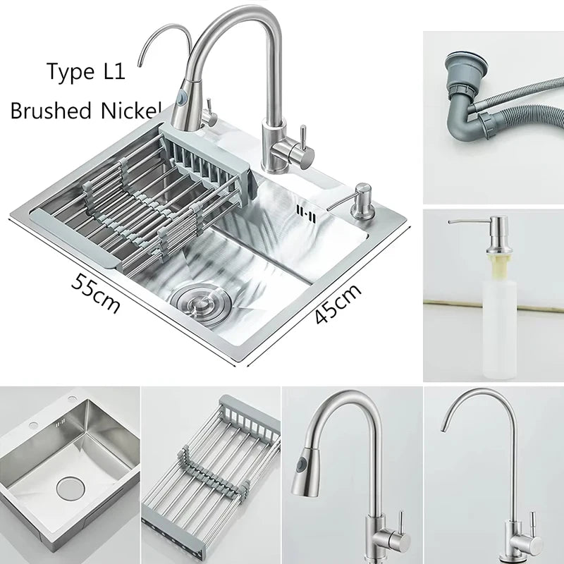 Edelstahl-Küchenspüle mit Wasserhahn, Trinkwasserhahn/Seifenspender, 55 x 45 cm, Spülbecken-Set mit Abflussset/Korb