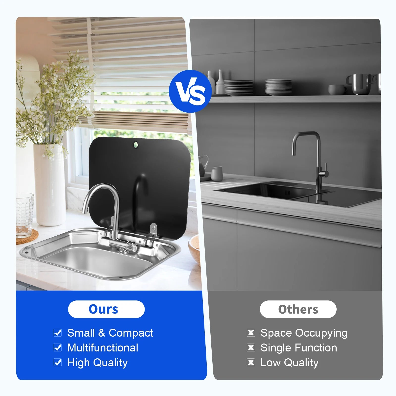 Edelstahlspüle mit klappbarem Wasserhahn und Deckel, Bar, Wohnwagen, Wohnmobil, kleines Boot, Handwaschbecken, Outdoor-Küchenspüle für Reisen