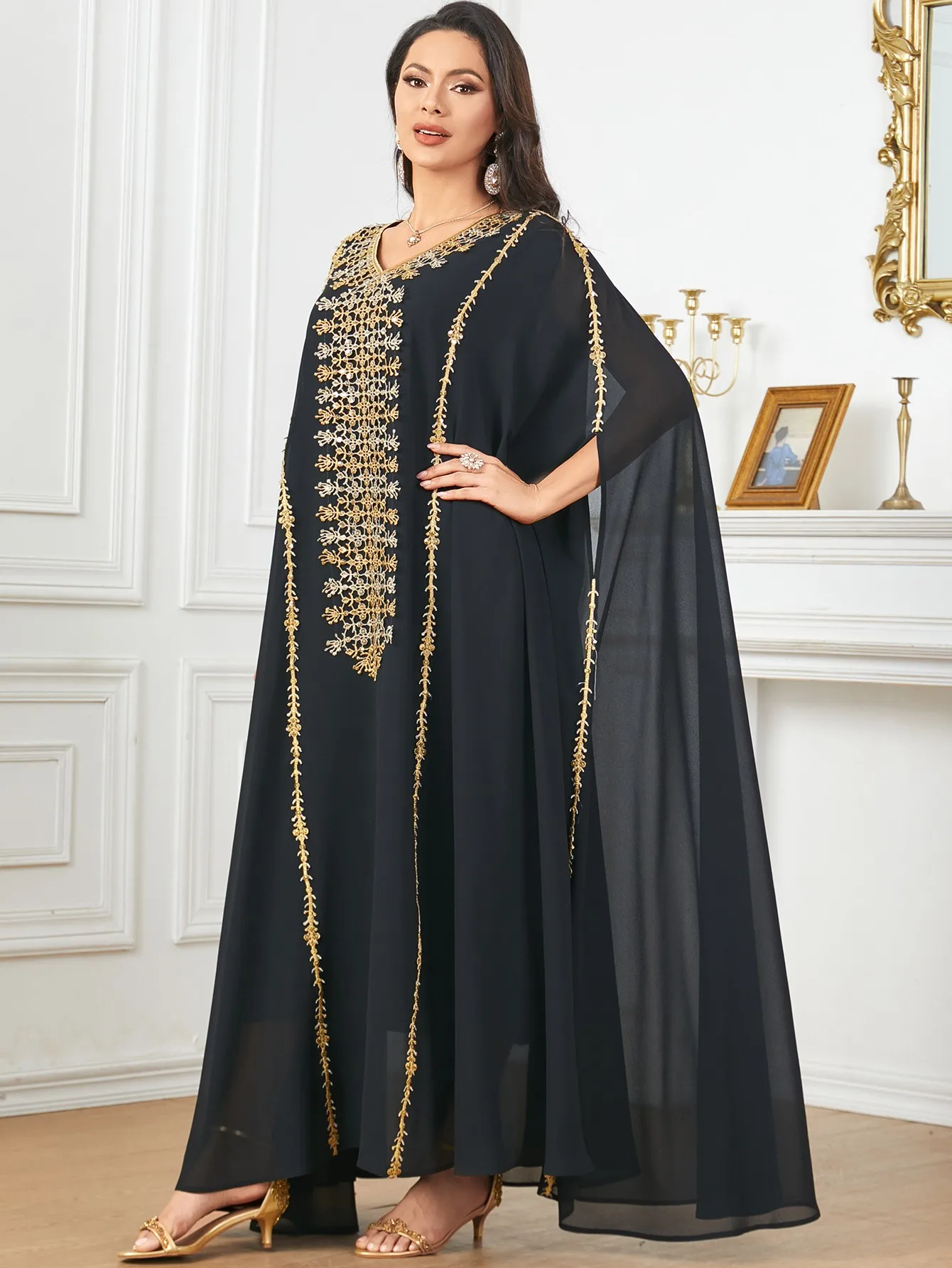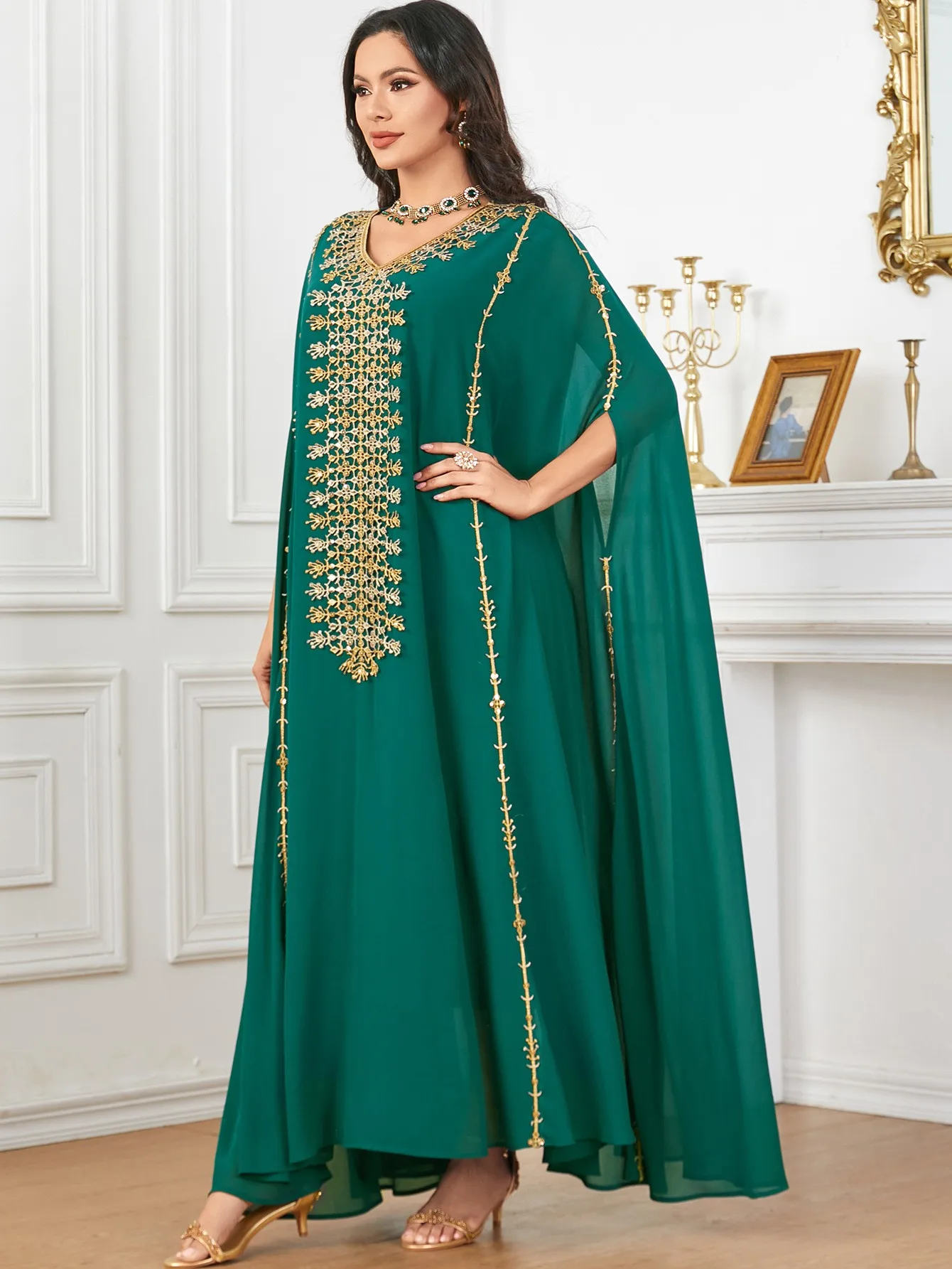 Dieses langärmlige Kleid hat einen raffinierten V-Ausschnitt und Fledermausärmel und strahlt einen Hauch von Eleganz und Raffinesse aus.