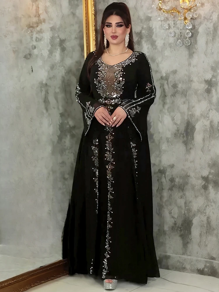 Elegante Frauen Abendkleid Langarm Chiffon Maxi Roben Luxus Diamant Party Kleider Dubai Türkei Abayas Kaftan Marocaine Femme
