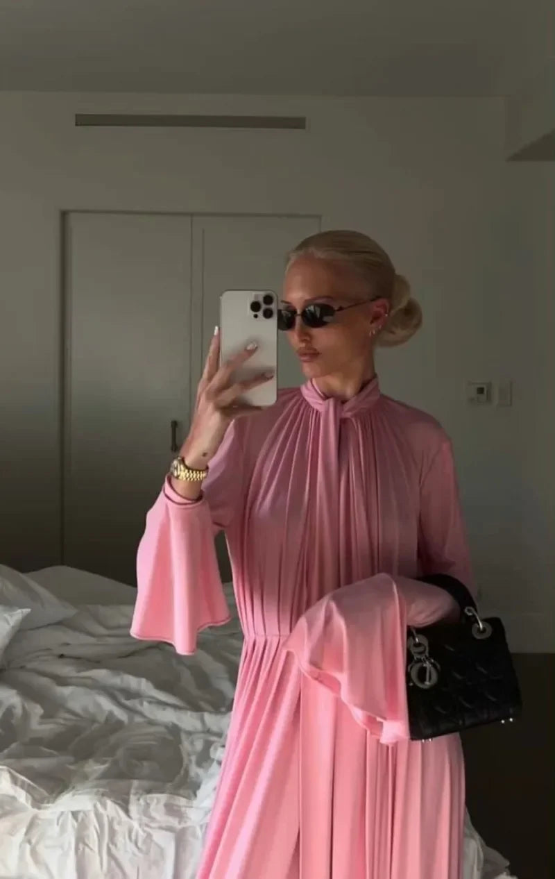 Genießen Sie den Retro-Charme mit diesem Y2K-inspirierten Kleid mit V-Ausschnitt und ausgestellten Ärmeln für einen Vintage-Touch.