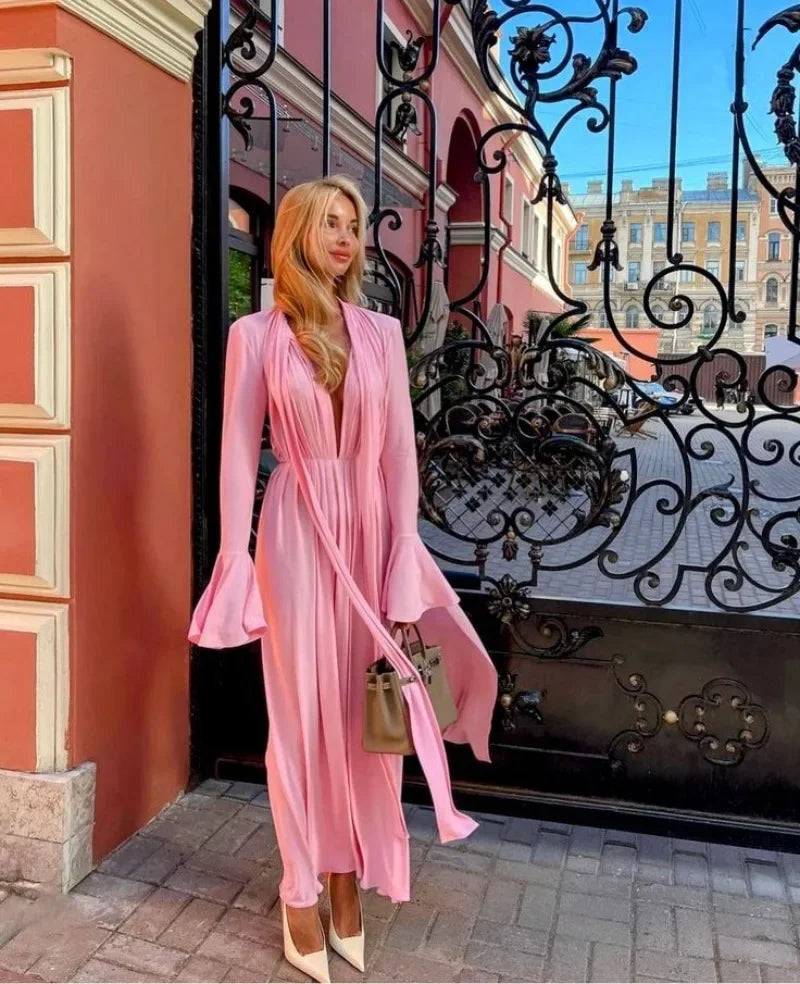 Elegante Y2K Mode Lange Flare Hülse V-ausschnitt Floral Schlitz Party Abendkleid Robe Vintage Frauen Falten Langes Kleid
