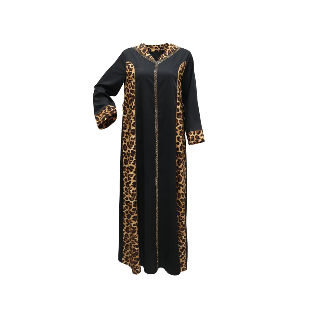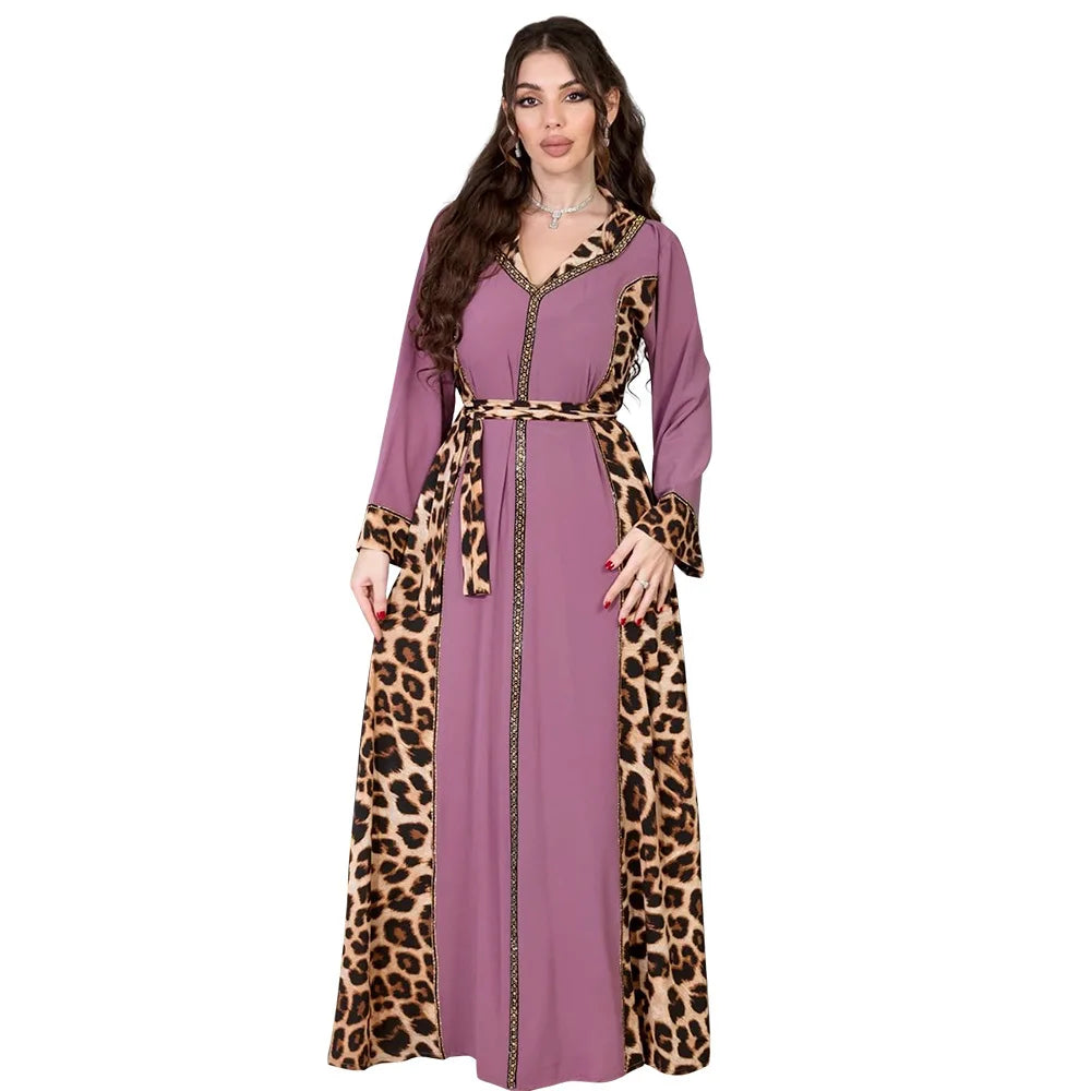 Elegantes arabisches Frauen-Partykleid, afrikanischer V-Ausschnitt, Leopardenmuster, langärmelig, Abaya, modische muslimische Dame, Urlaubskleid, islamische Kleidung