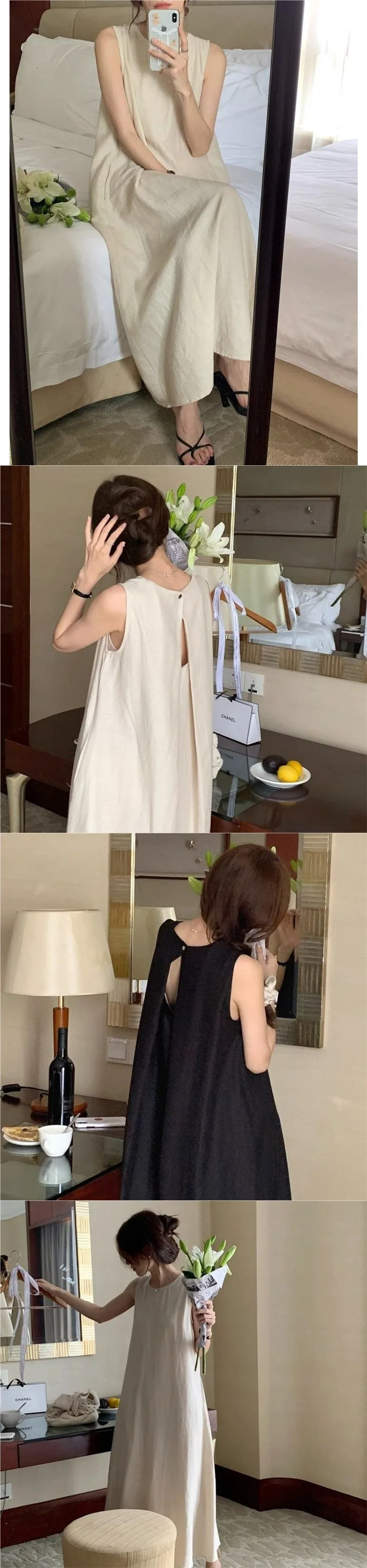 Elegantes ärmelloses langes Westenkleid für Damen, lockerer Rücken, hohles Design, Rundhalsausschnitt, Frühlingsausflugskleid, Prinzessinnenärmel, Polokragen