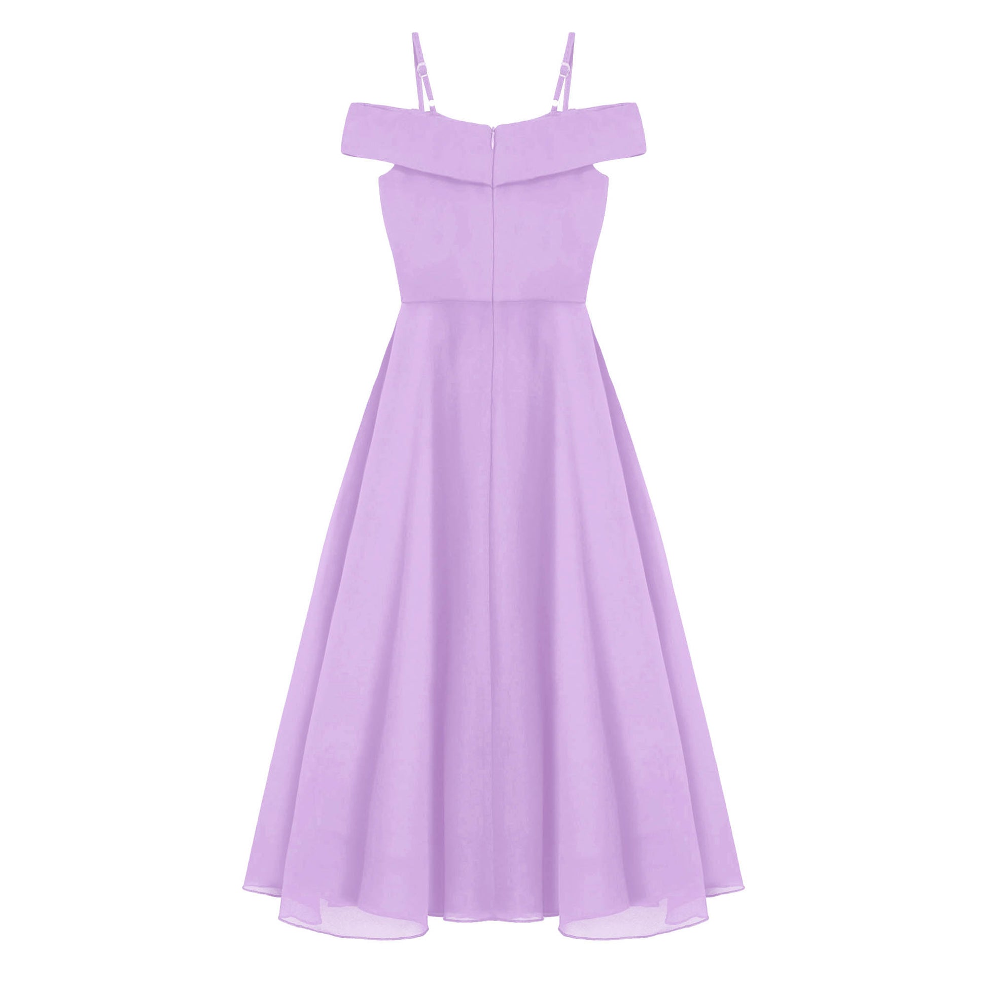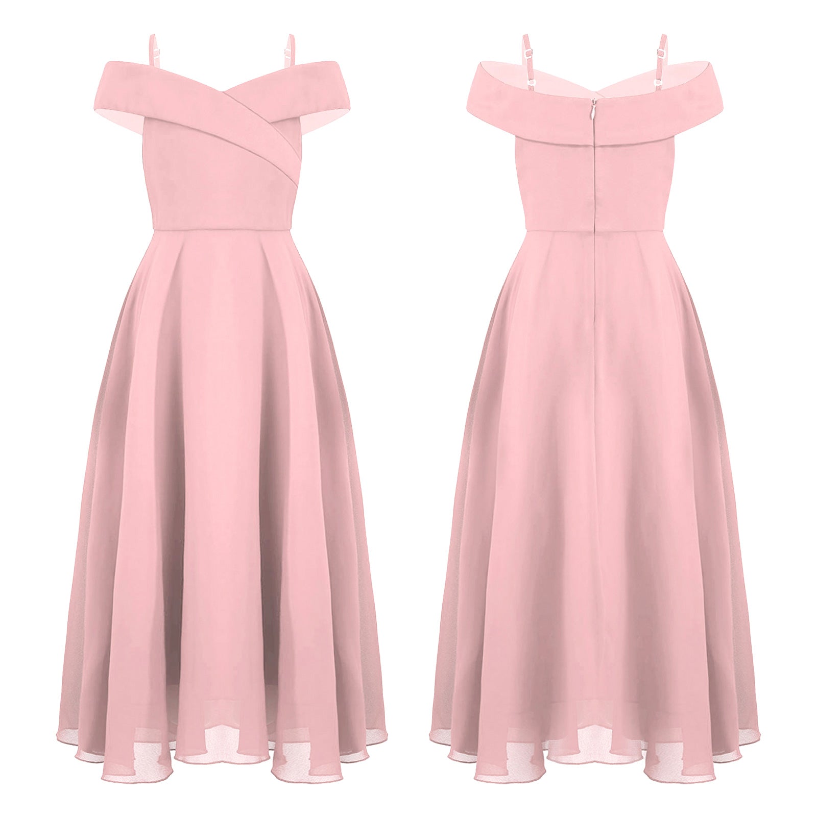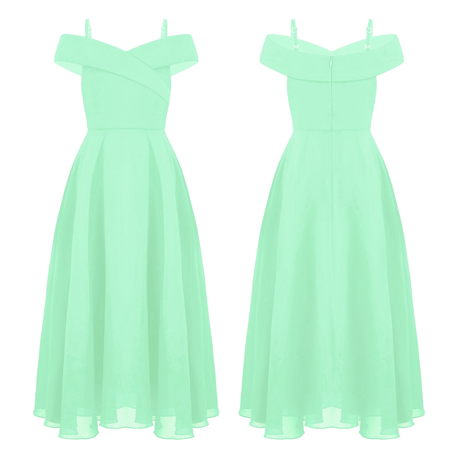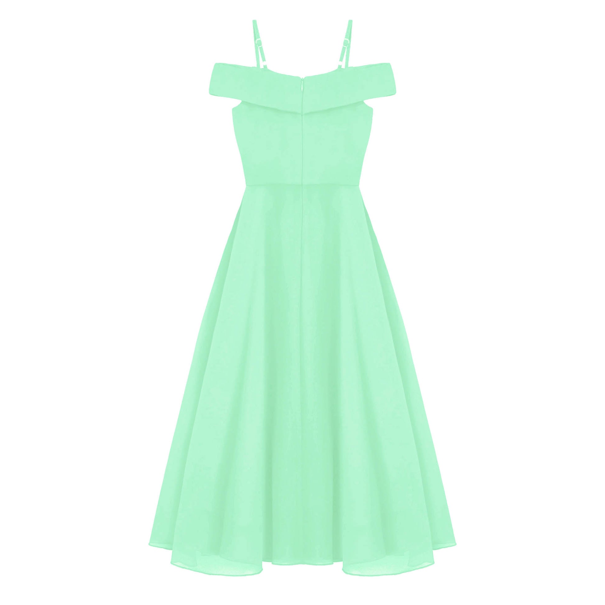 Elegantes Chiffon-Partykleid für Mädchen, schulterfrei, verstellbarer Spaghettiträger, bodenlanges Maxikleid für Hochzeit, Geburtstag, Abend