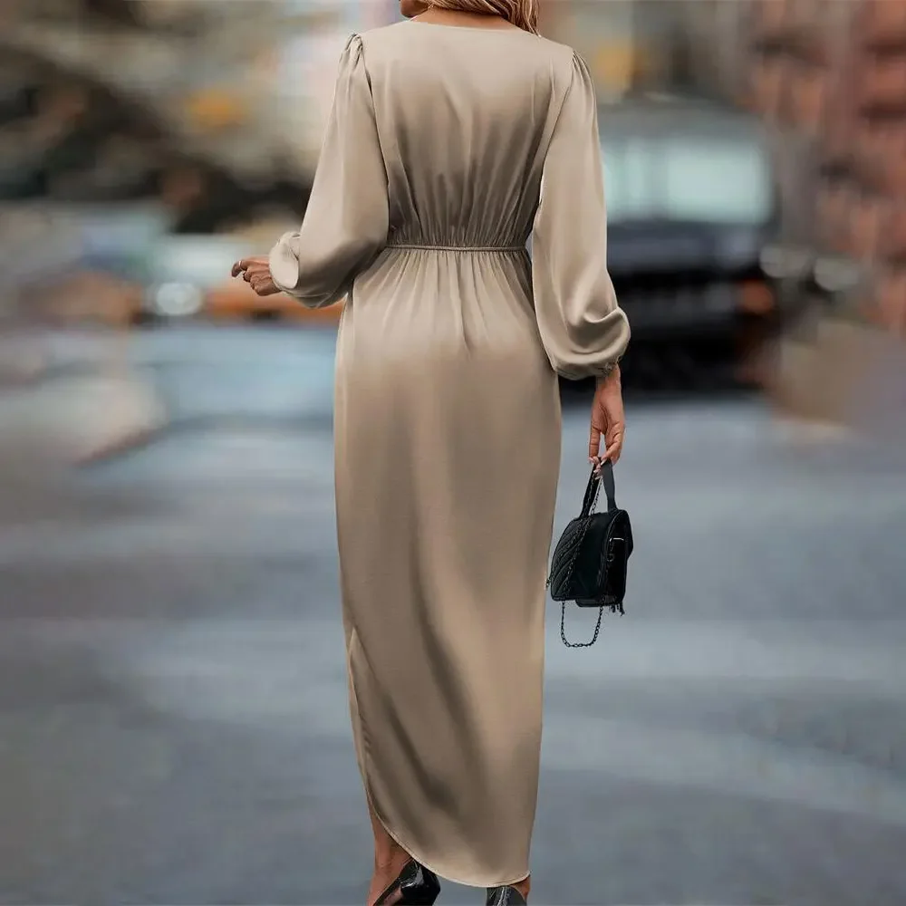 Elegantes, langärmliges, asymmetrisches Kleid mit überkreuztem Ausschnitt, Damenkleid, Blasenärmel, in voller Länge, A-Linie, Midikleid für Damen