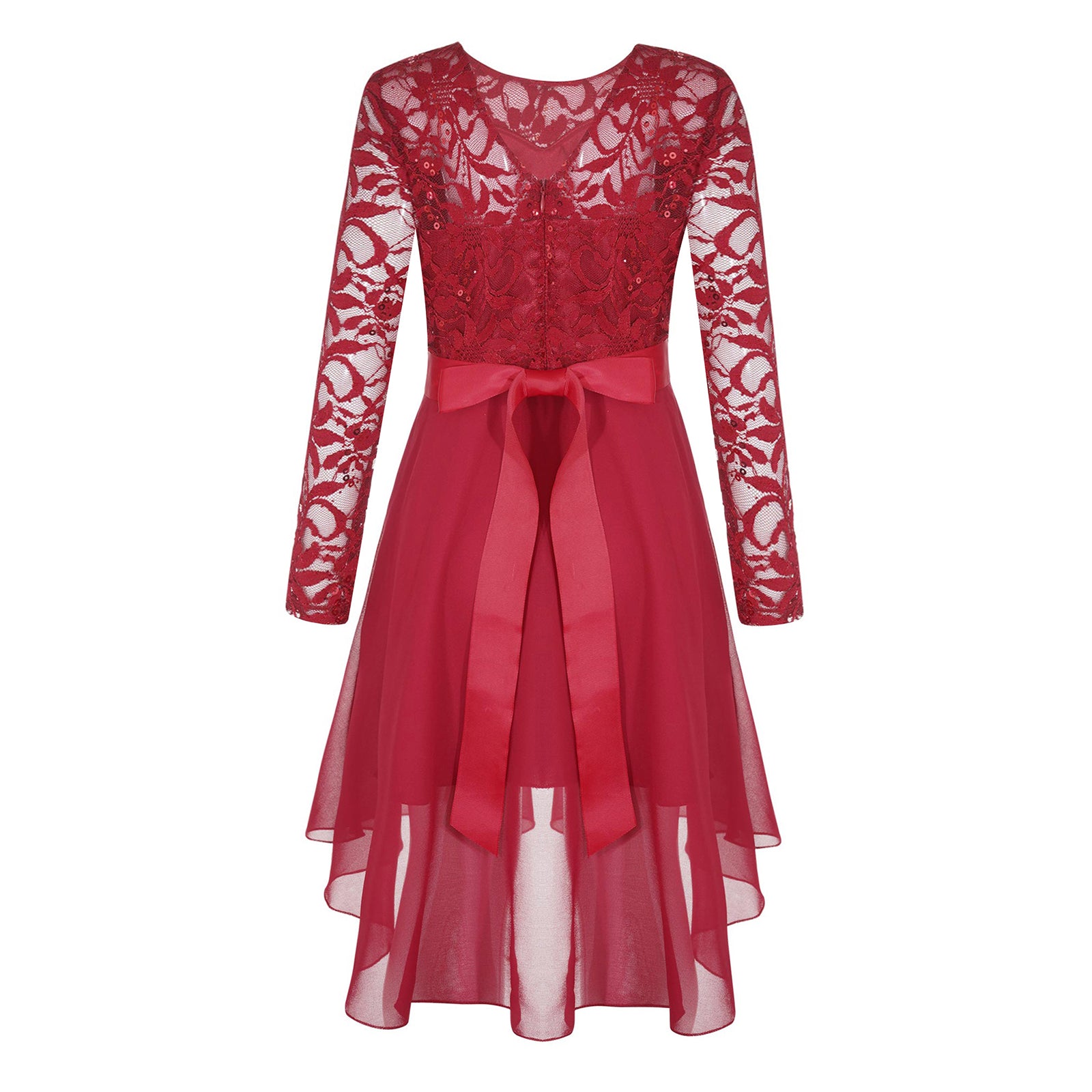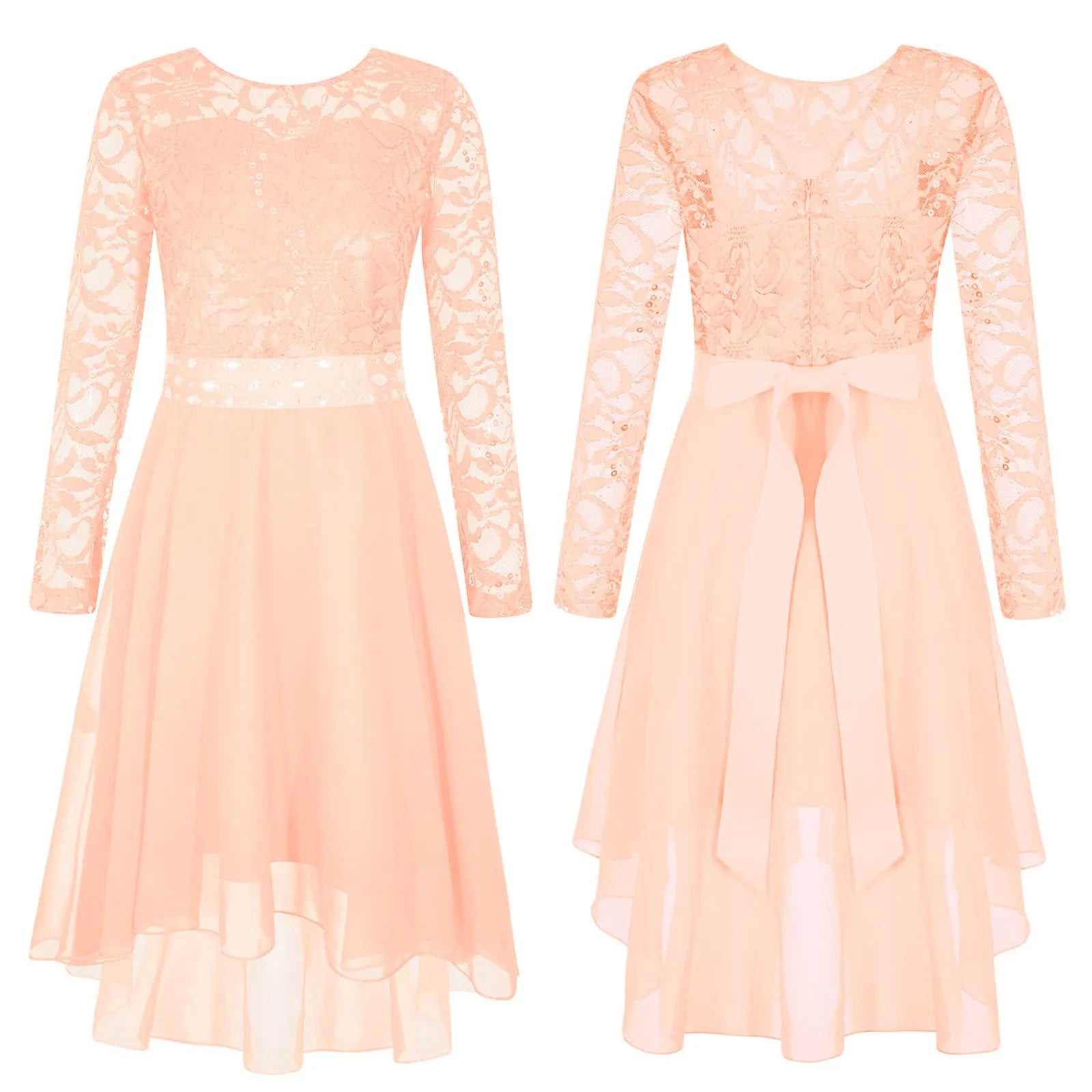 Elegantes Spitzen-Partykleid für Kinder, Mädchen, Chiffon, Spleißen, langärmelig, Kleid mit hohem und niedrigem Saum und Strass-Schärpe für Hochzeit, Geburtstag