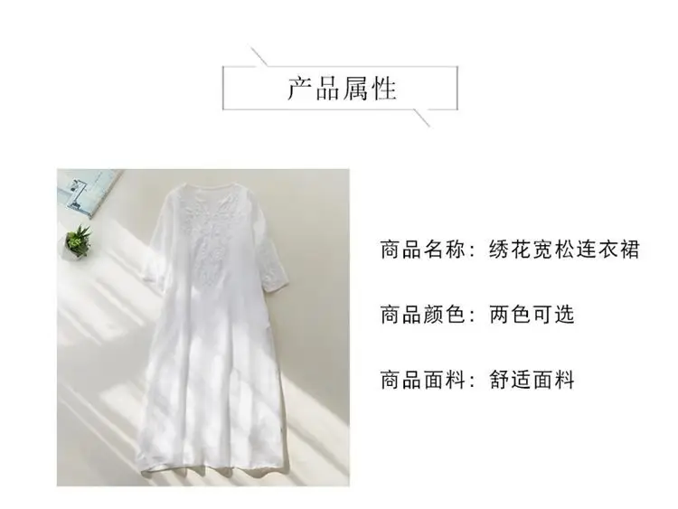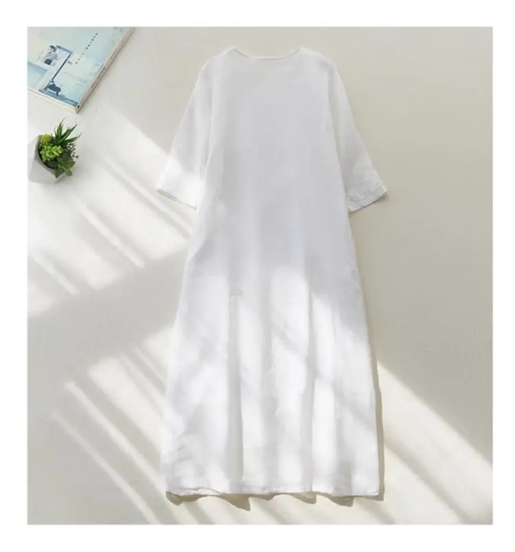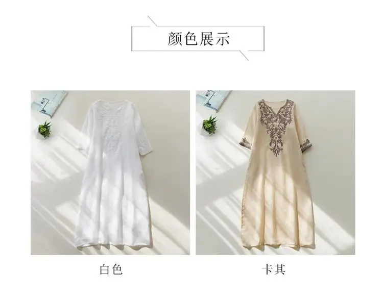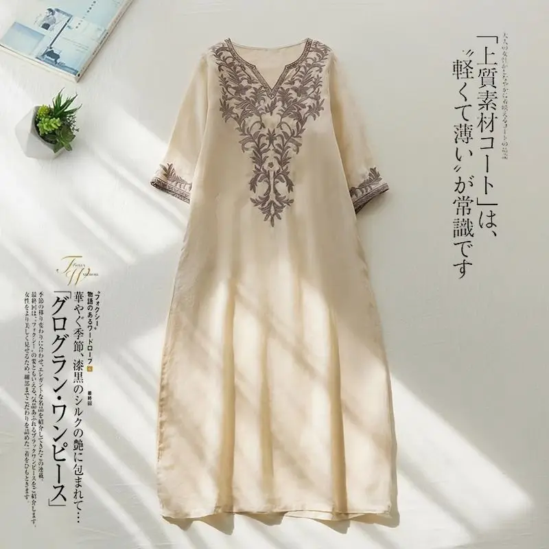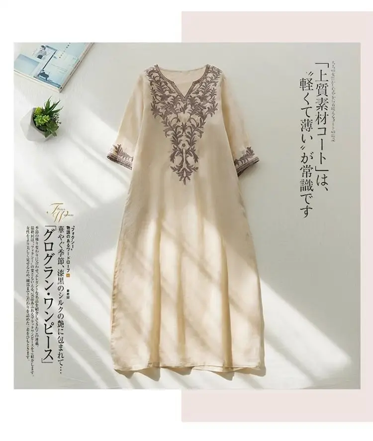 Ethnisches Vintage-Kurzarmkleid aus schwerer Stickerei aus Baumwolle und Leinen für Damen, lockeres langes Sommerkleid mit V-Ausschnitt und elegantem Stil
