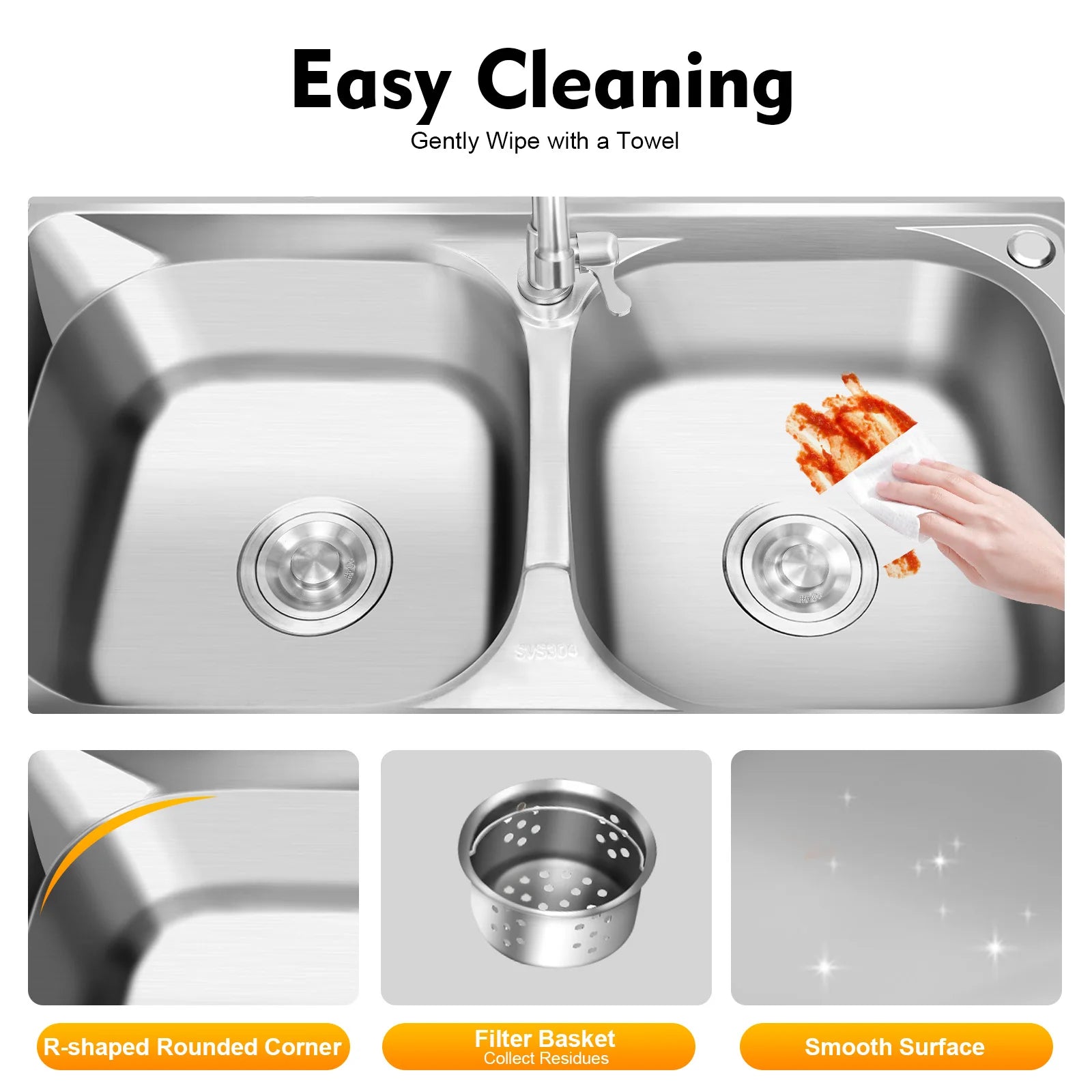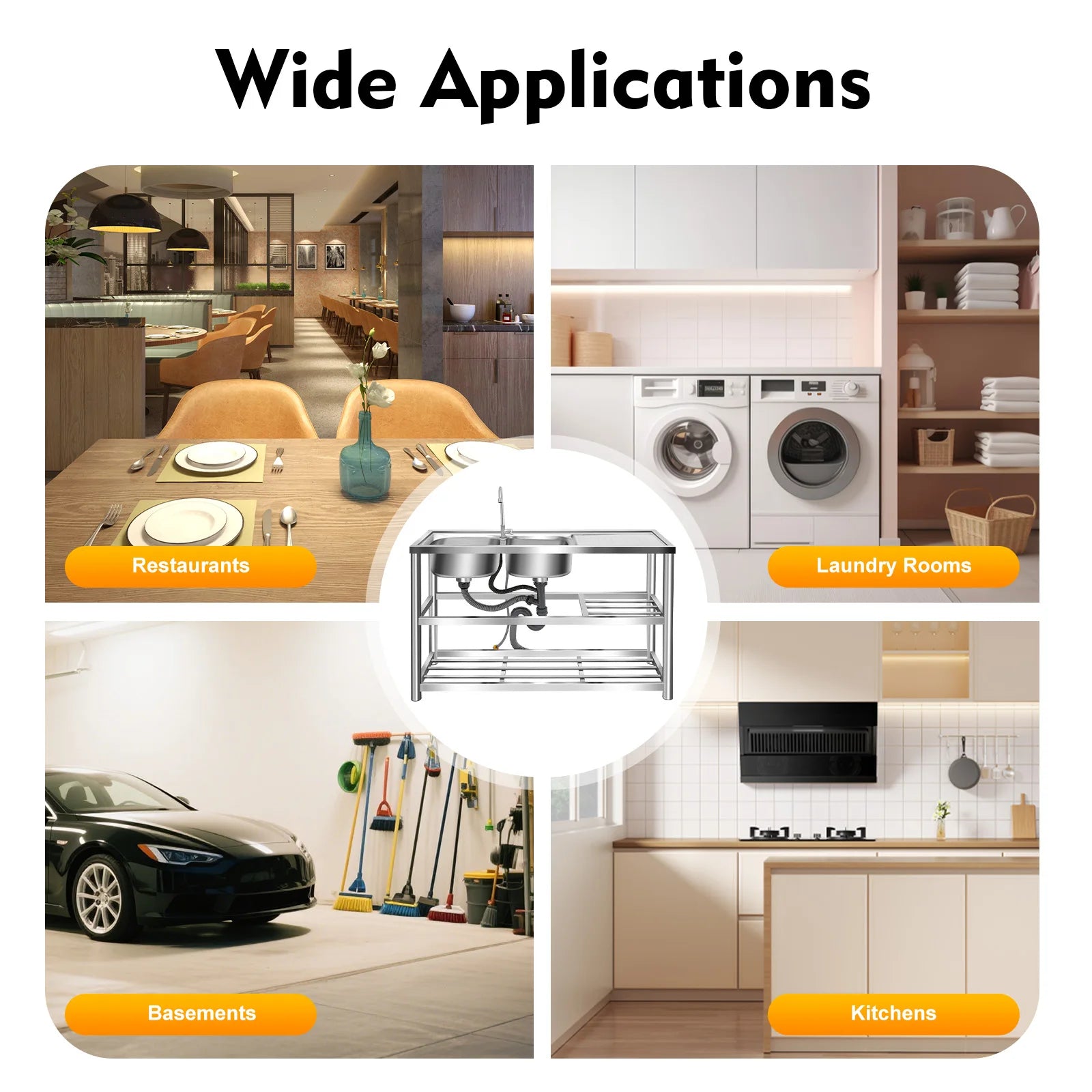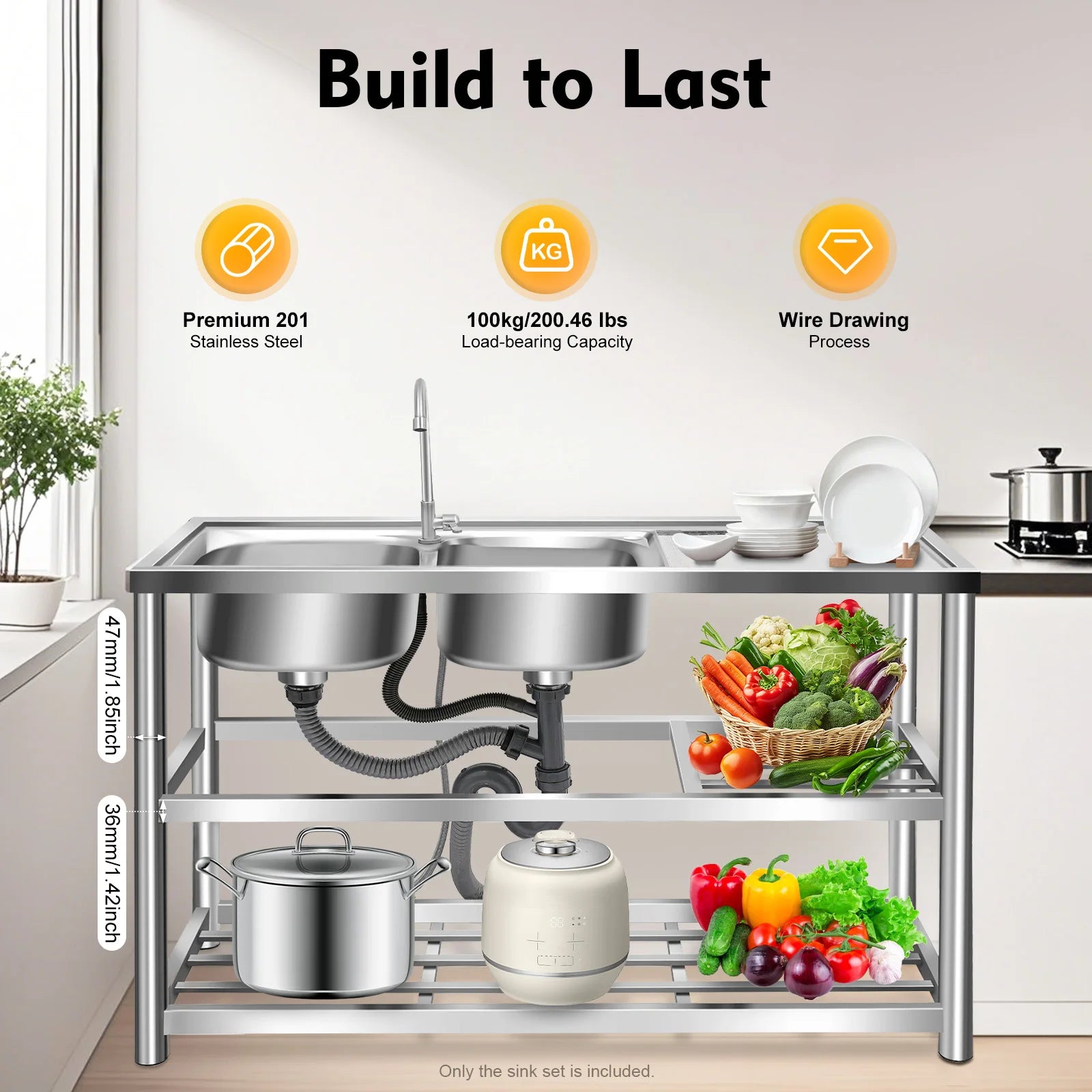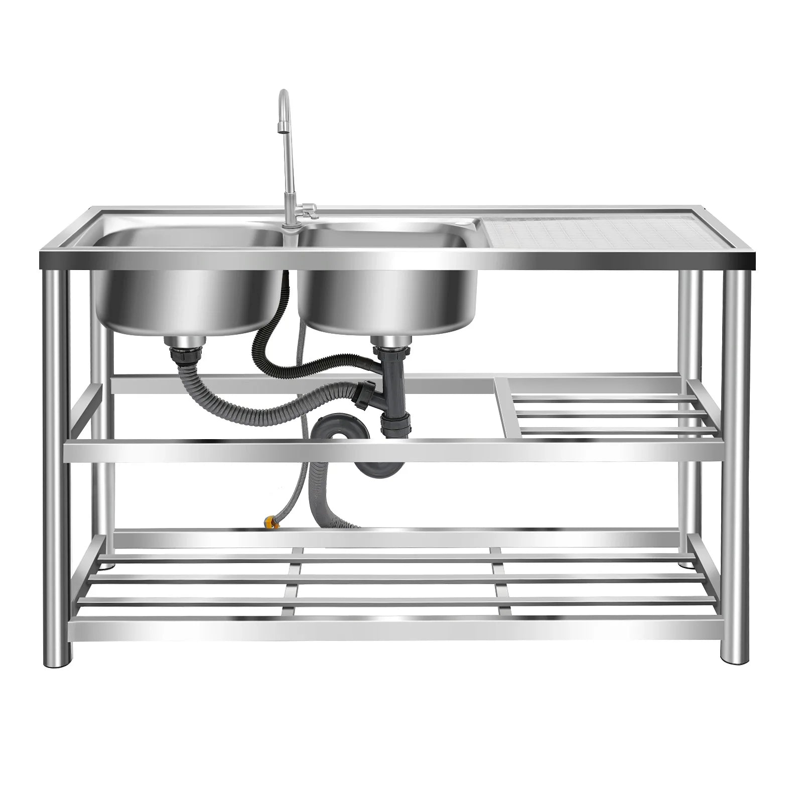 Freistehendes Doppelwaschbecken-Set aus Edelstahl mit Wasserhahn, 3-stufiges Aufbewahrungs-Küchenspüle-Set für den gewerblichen Gebrauch in der Küche, Wäsche