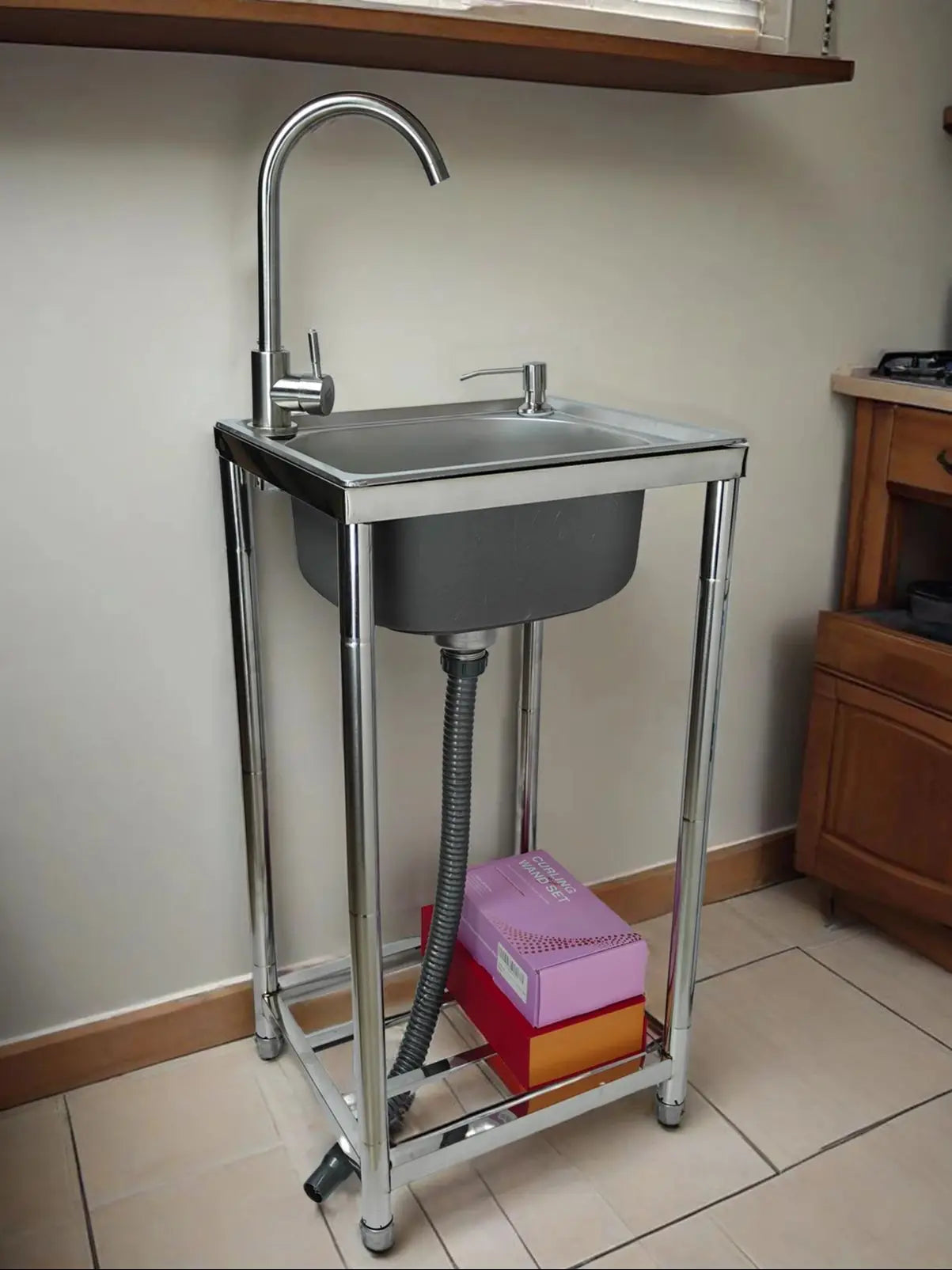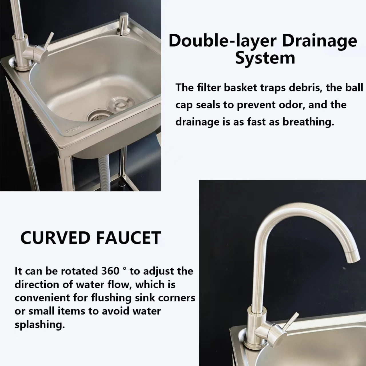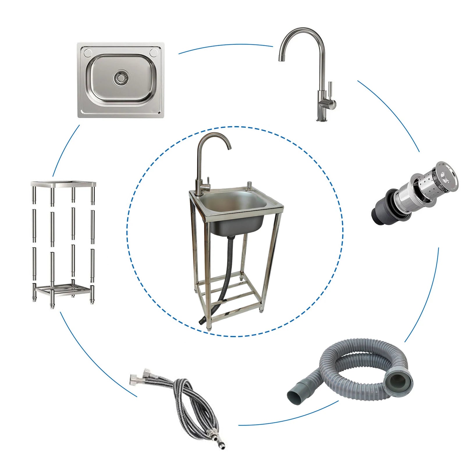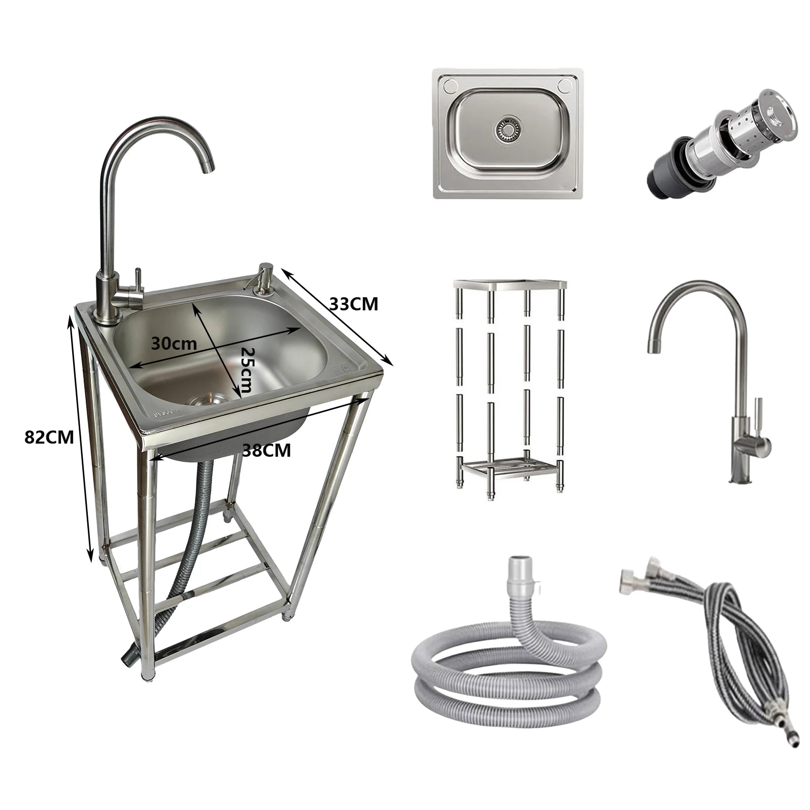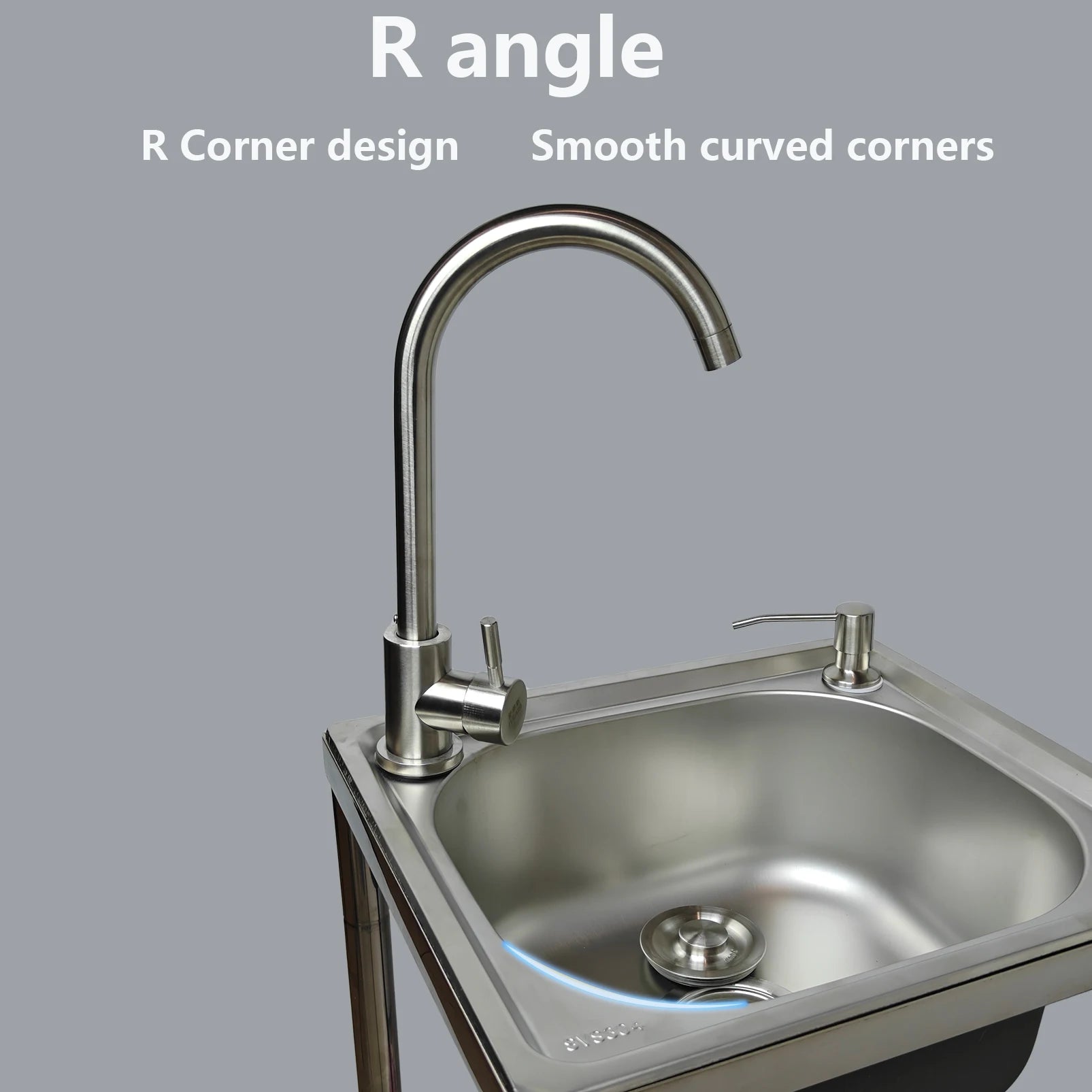 Freistehendes Edelstahl-Waschbecken, Außenspüle, Einzelschüssel, tragbares Outdoor-Camping-Waschbecken mit Abfluss und Warm- und Kaltwasserhahn