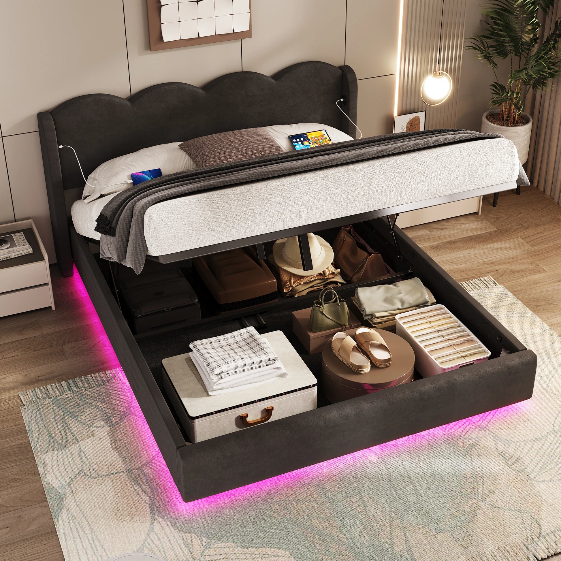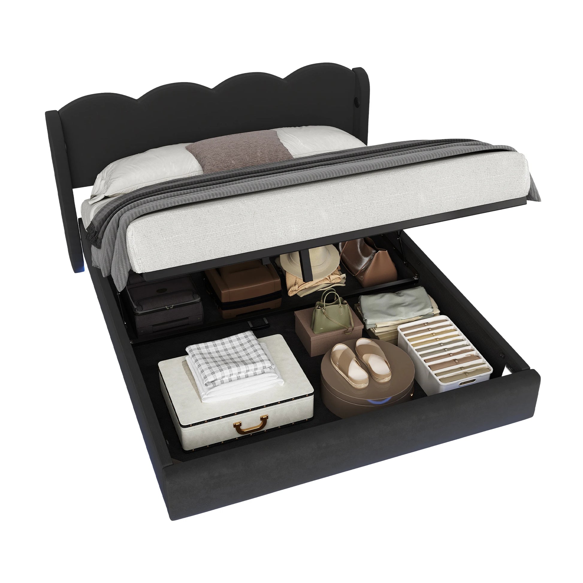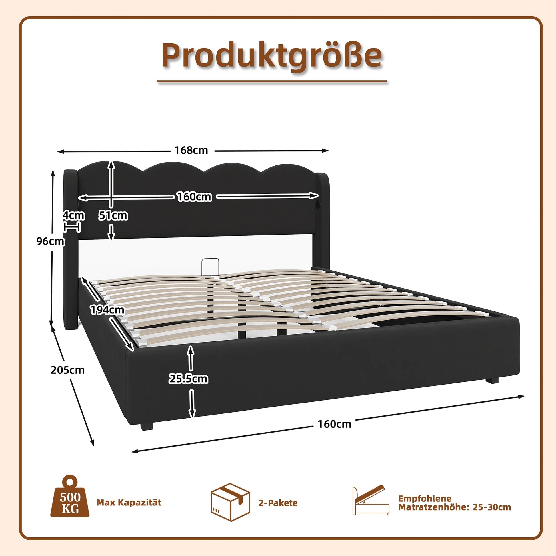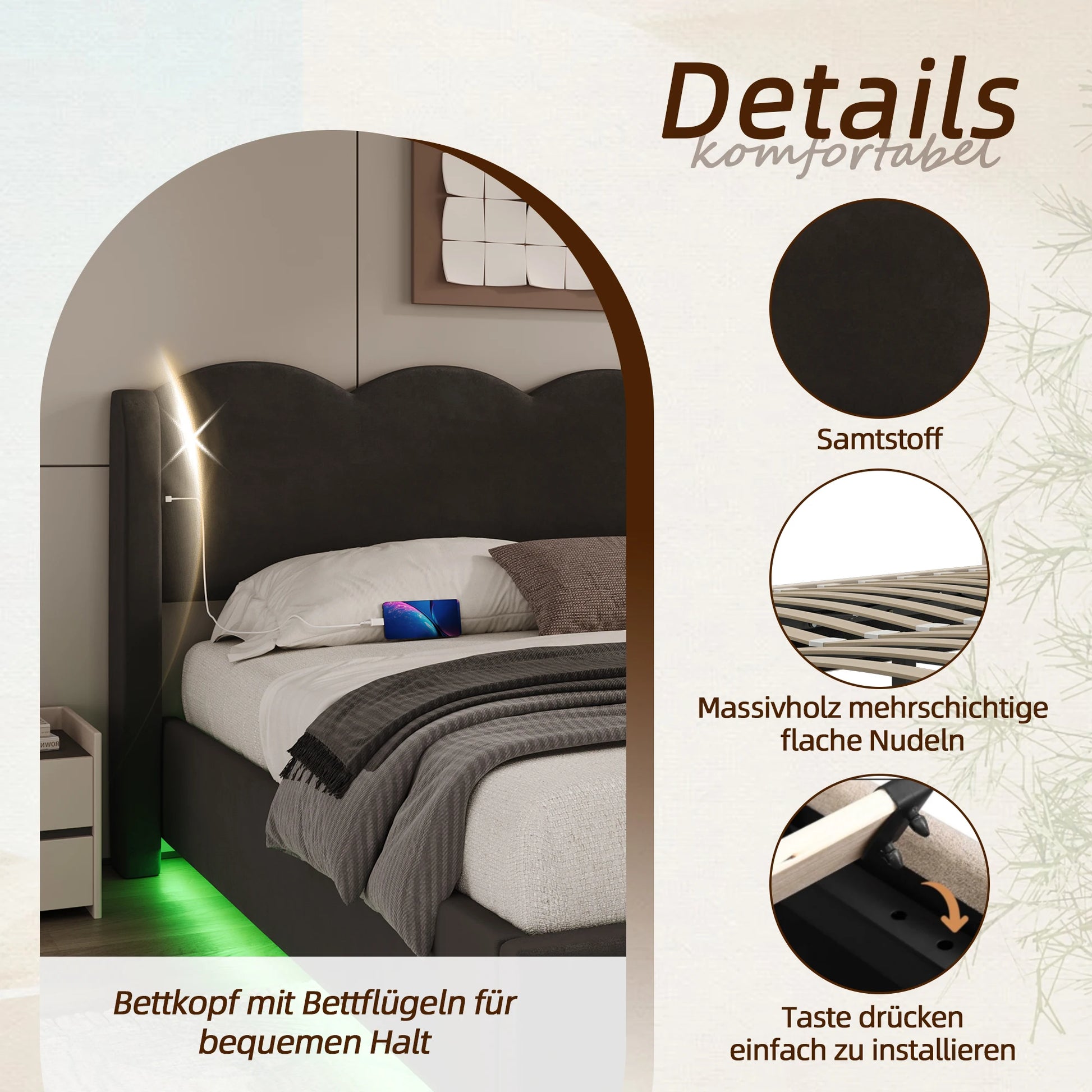 Gepolstertes Doppelbettrahmenpaneel, flache Nudelrahmenhalterung aus Wellpappe, mit LED-Licht, USB+C-Schnittstellenaufladung, 160 cm × 200 cm