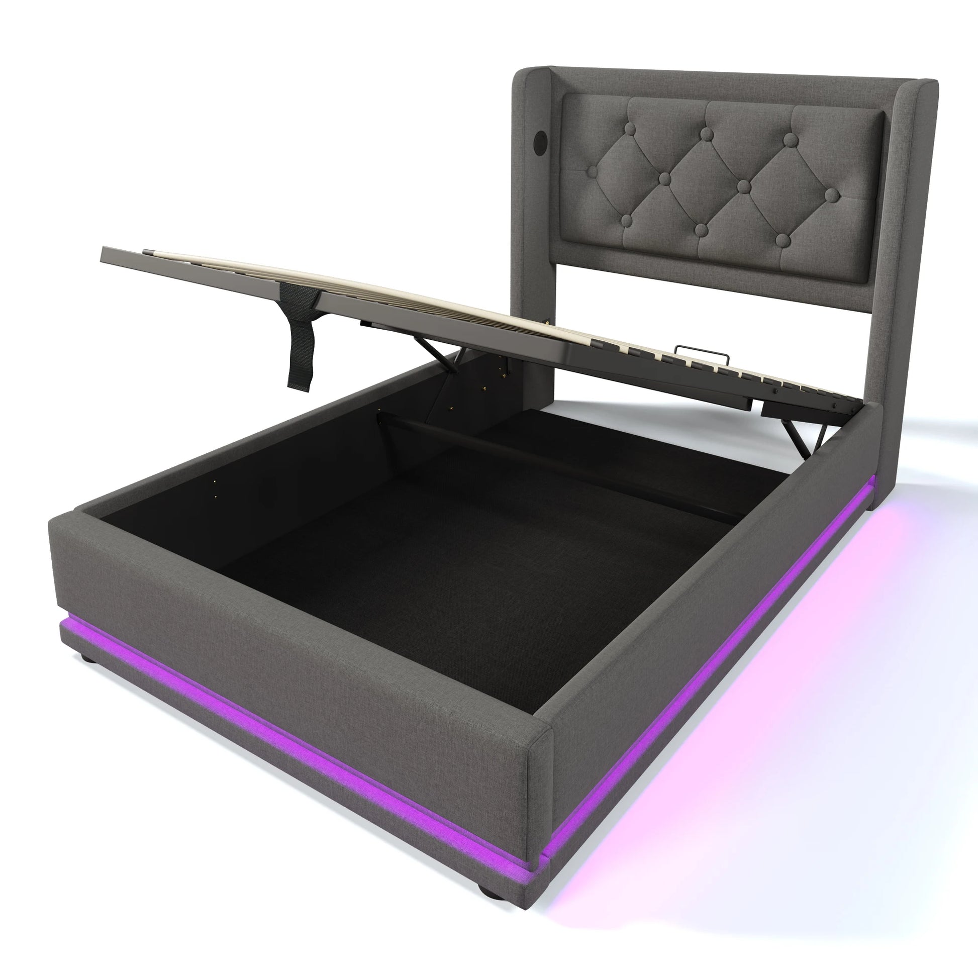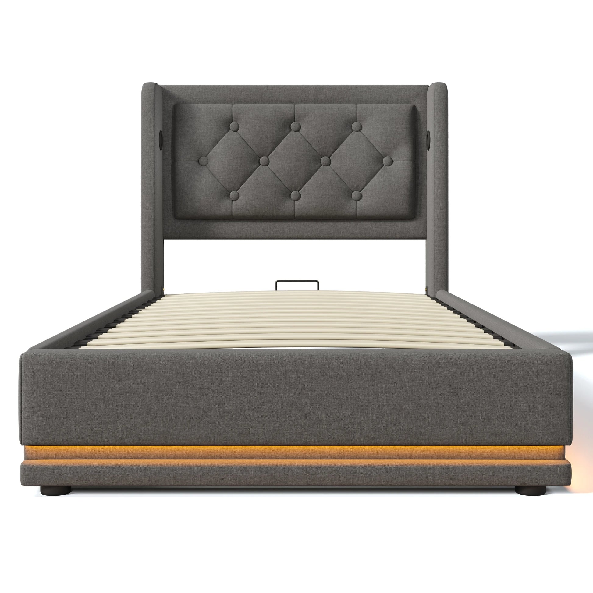 Gepolstertes Einzelbett 90x200 cm, graue Baumwolle, USB-C-Aufladung, 3-seitige LED (keine Matratze)