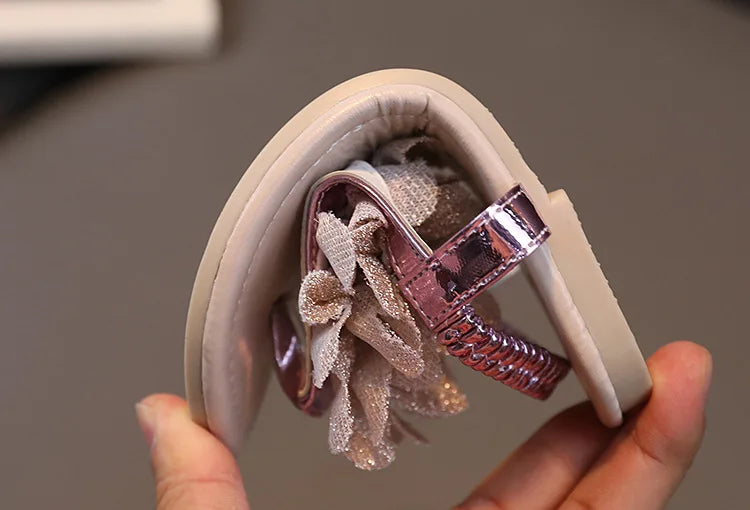 Girls Sandals 2023 Summer New Bling Flowers Baby Children Fashion Soft Bottom Student Shoes Kid's Slippers Pink Flats Flip Flops