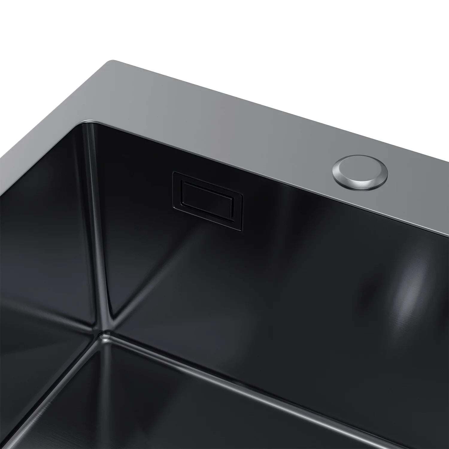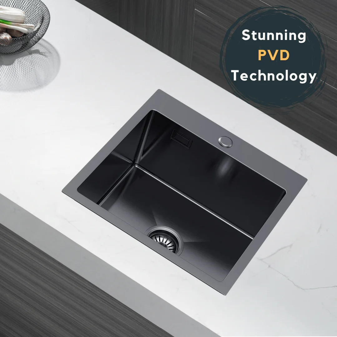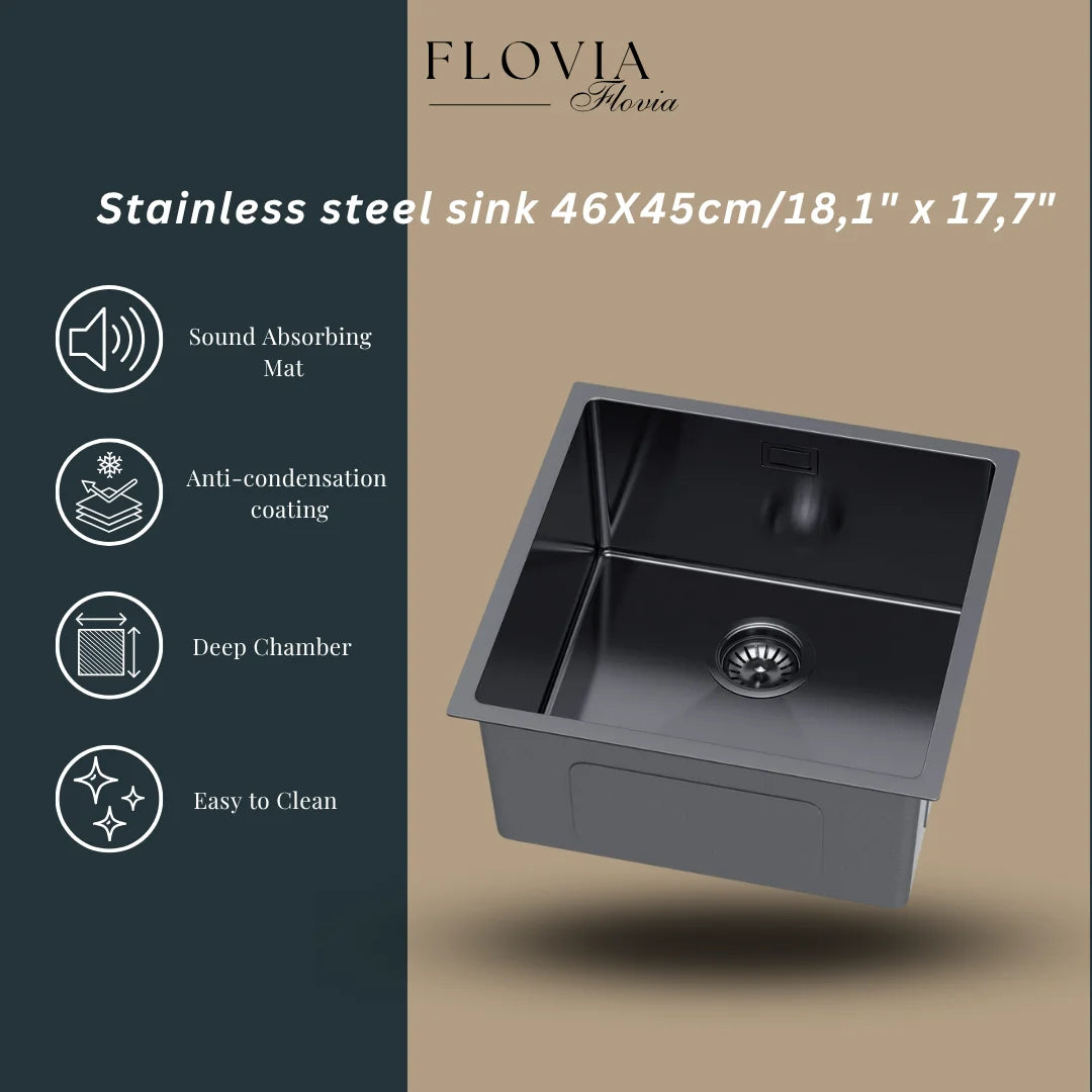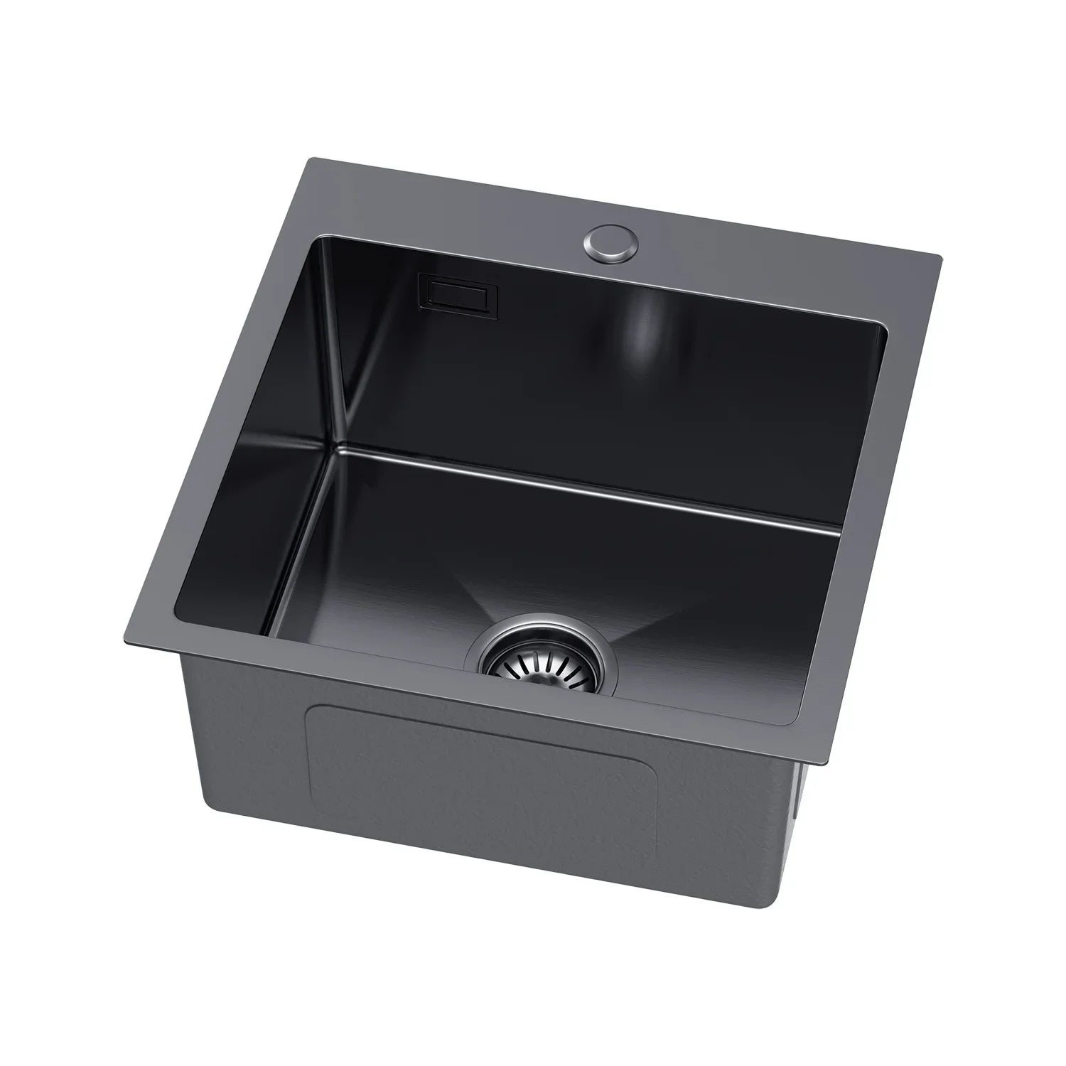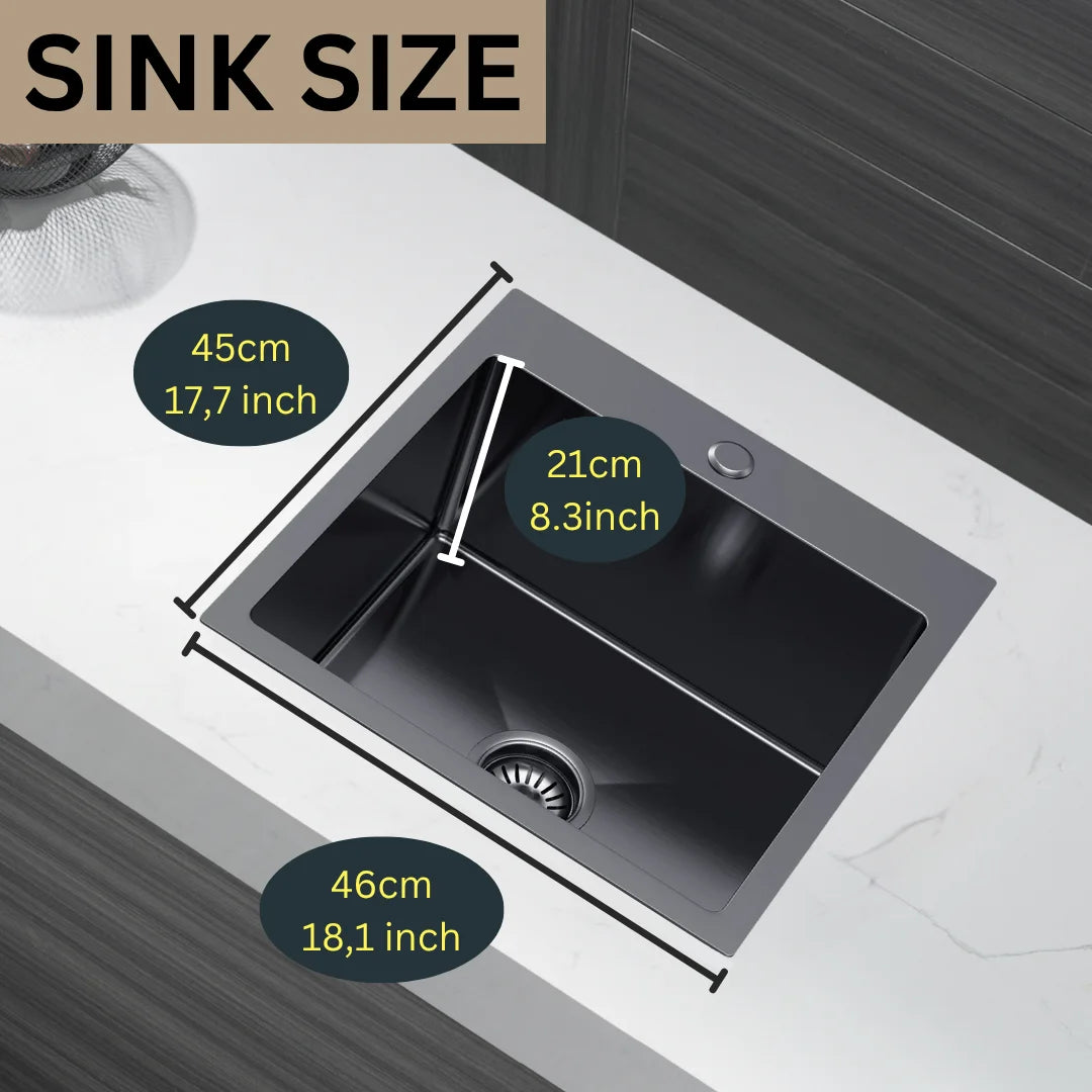 Graphitschwarzes Edelstahlspülbecken 46 x 45 cm – Einzelschüssel-Topmount – mit Abflusssatz, Überlauf und Zubehör