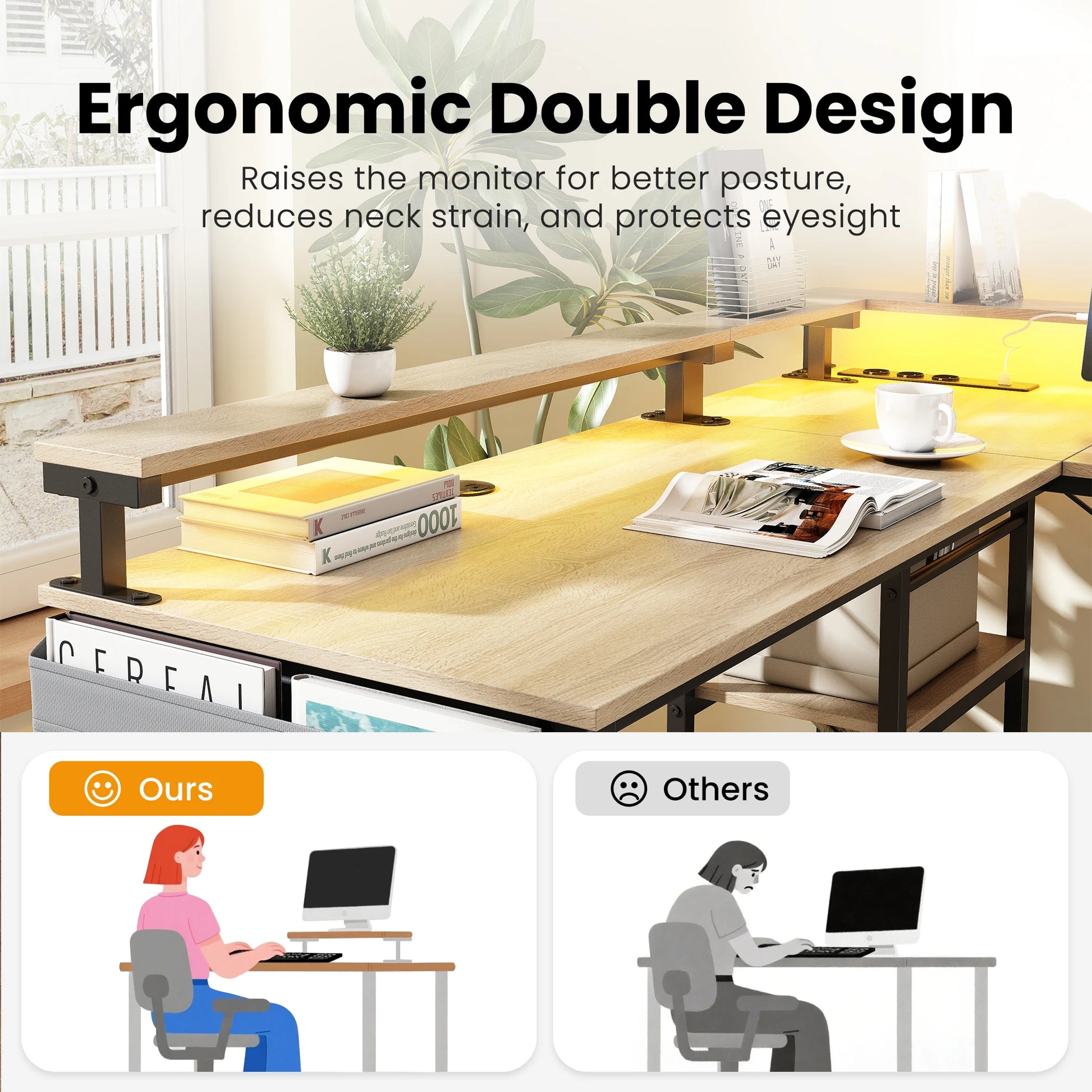 Großer Eckschreibtisch L-Form mit Regal, Monitorständer, Ablage, flexibel montierbar, Beige