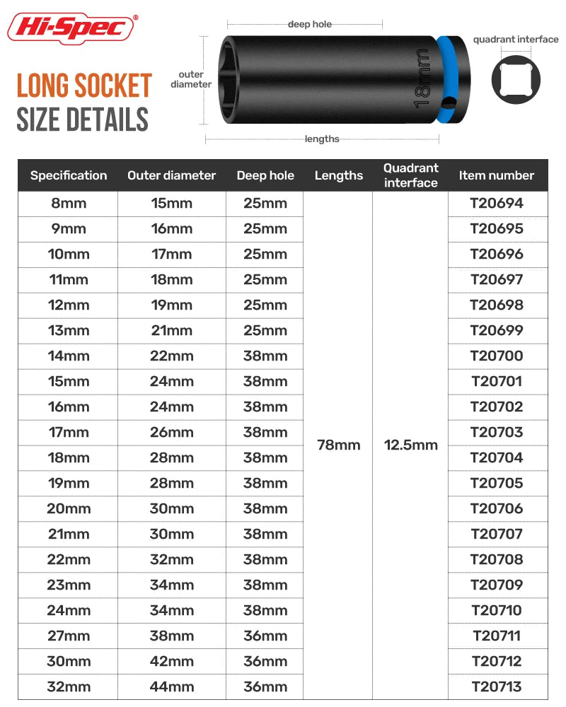 Hi-Spec 1/2" Drive Impact Socket Set Impact Wrench Sockets Cr-mo Hex Sockets CR-V Handwerkzeuge zum Entfernen großer Innensechskantmutter