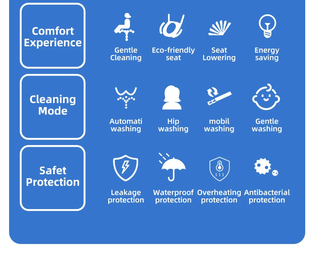 Erweiterte Funktion: Sofortiger Bleisatz,Fernbedienung,Wassertemperatur-Justage,Hinterteil-Waschen,Weibliche Reinigung,Setzen Sie Heizung,Wasser-Druck-Justage,Warmer Luft-Trockner,Düse selbstreinigend,Automatische Desodorierung,Bewegliche Düsen-Reinigung