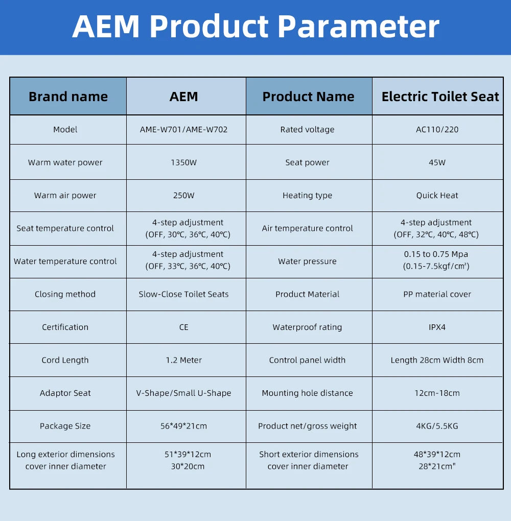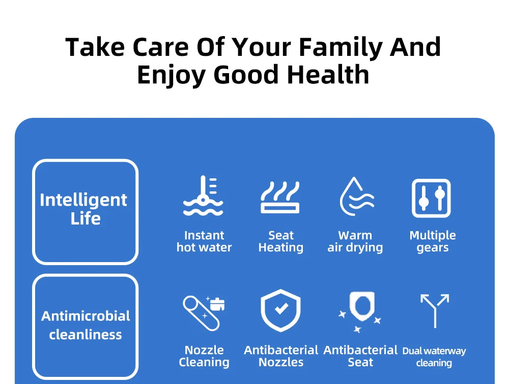 Intelligenter Bidet-Toilettensitz für Badezimmer, beheizter Sitz, langsames Schließen, warmer Trockner, hinten vorne, waschbar, warmes Wasser, Fernbedienung, Nachtlicht