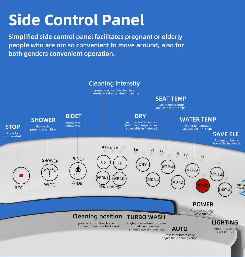 Erweiterte Funktion: Sofortiger Bleisatz,Fernbedienung,Wassertemperatur-Justage,Hinterteil-Waschen,Weibliche Reinigung,Setzen Sie Heizung,Wasser-Druck-Justage,Warmer Luft-Trockner,Düse selbstreinigend,Automatische Desodorierung,Bewegliche Düsen-Reinigung