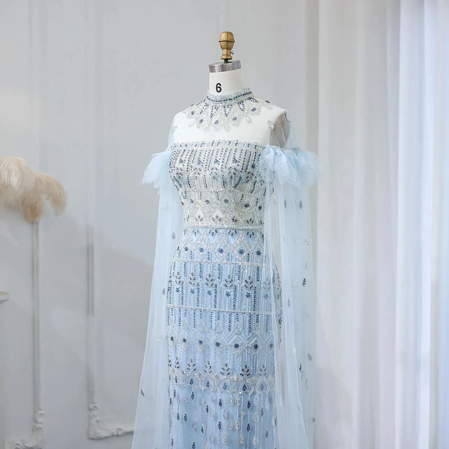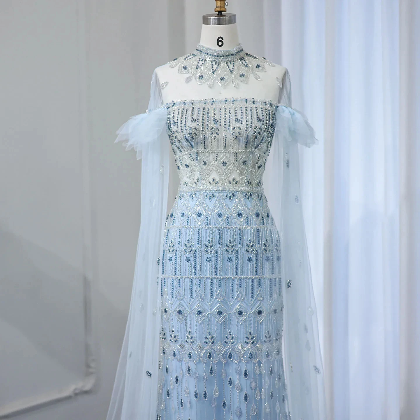 Jancember SZ096 Wholesale Illusal Lace Long Gown Women Party Plus Size Fashion Elegant Light Blue Evening Dress